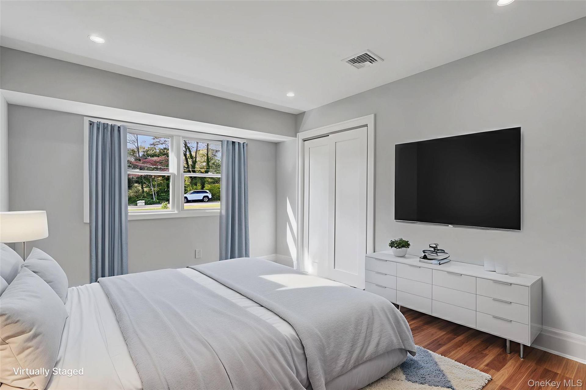 - Bedroom featuring dark wood-style floors, recessed lighting, and a closet