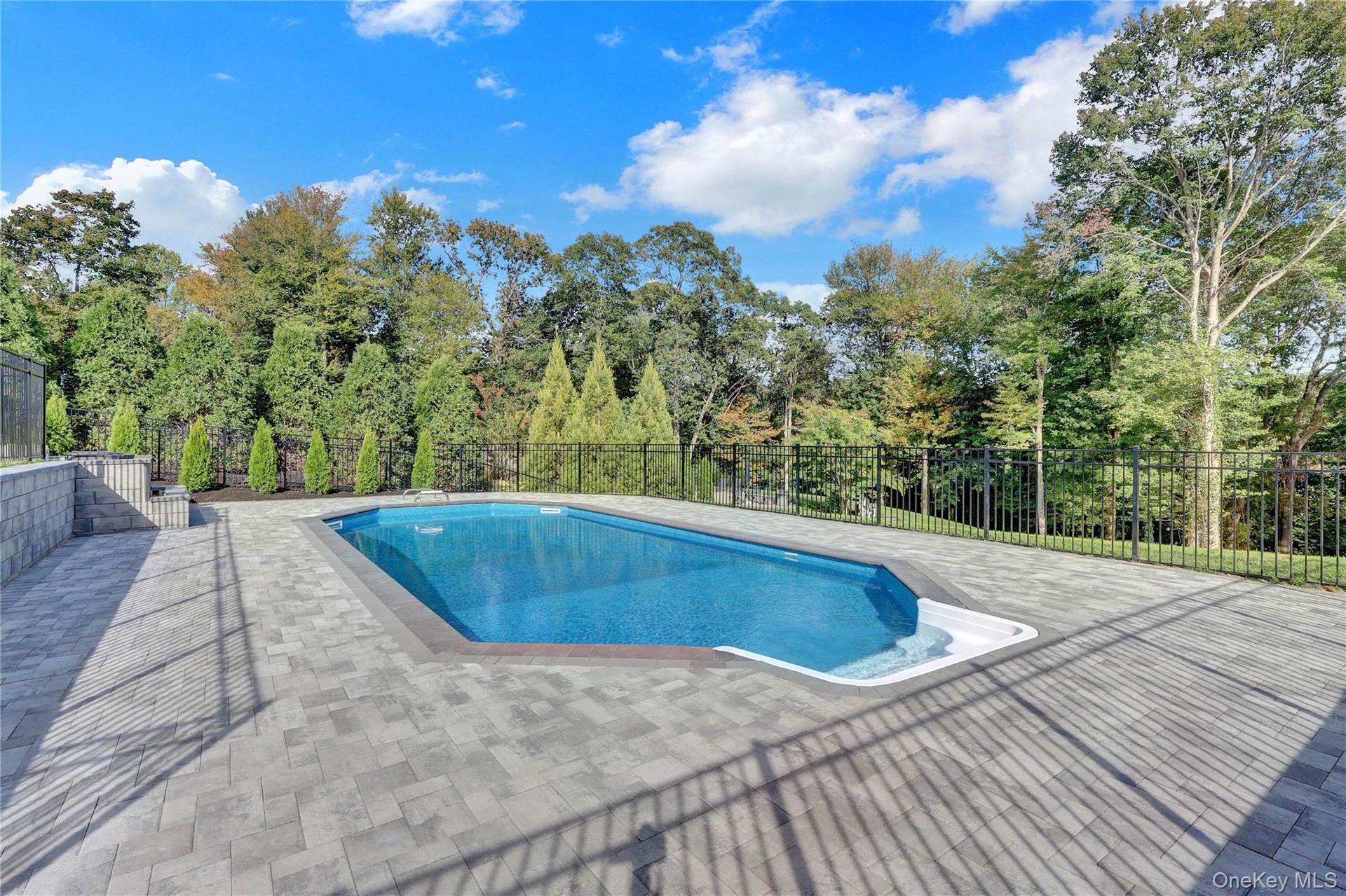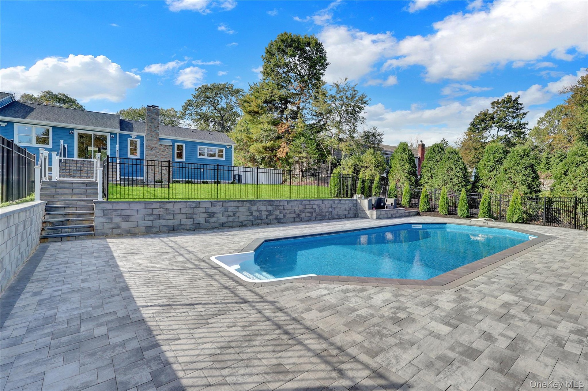- View of swimming pool with a patio area, a fenced backyard, and stairs