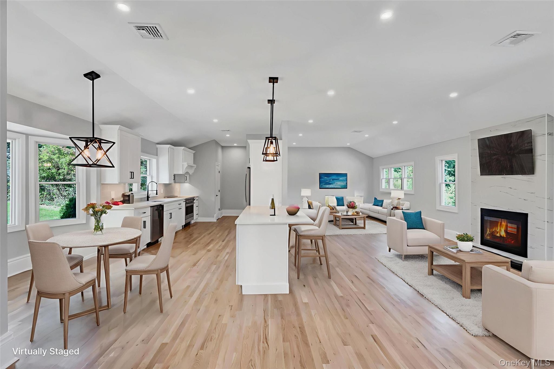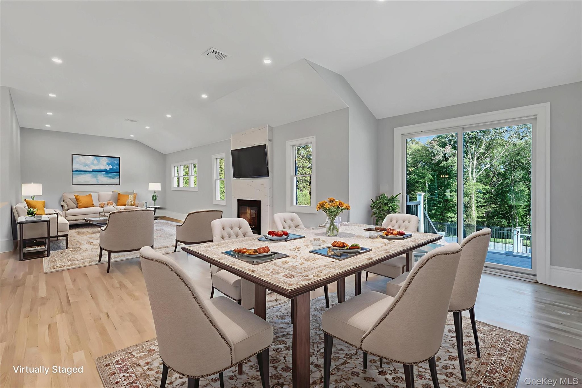 - Dining space featuring lofted ceiling, recessed lighting, light wood-type flooring, and a fireplace