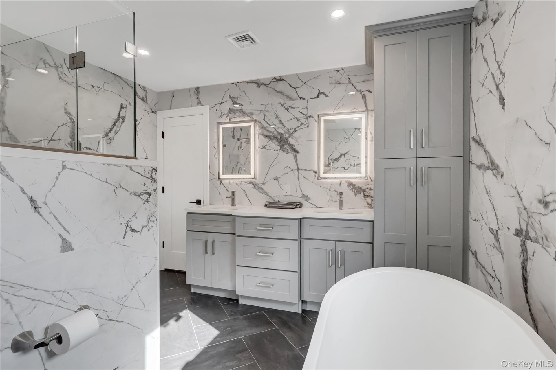 - Bathroom featuring stone wall, double vanity, a freestanding tub, tile walls, and recessed lighting