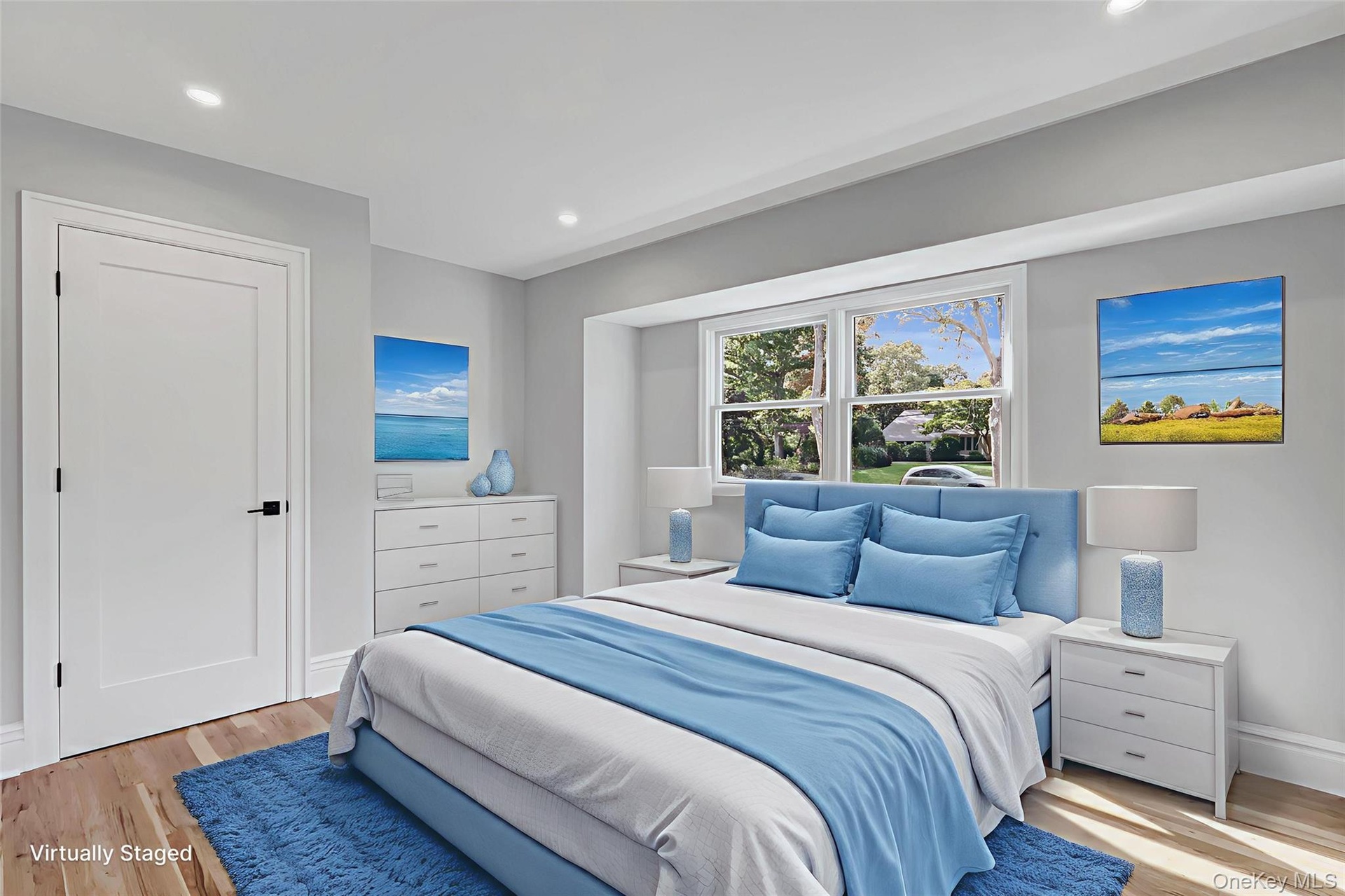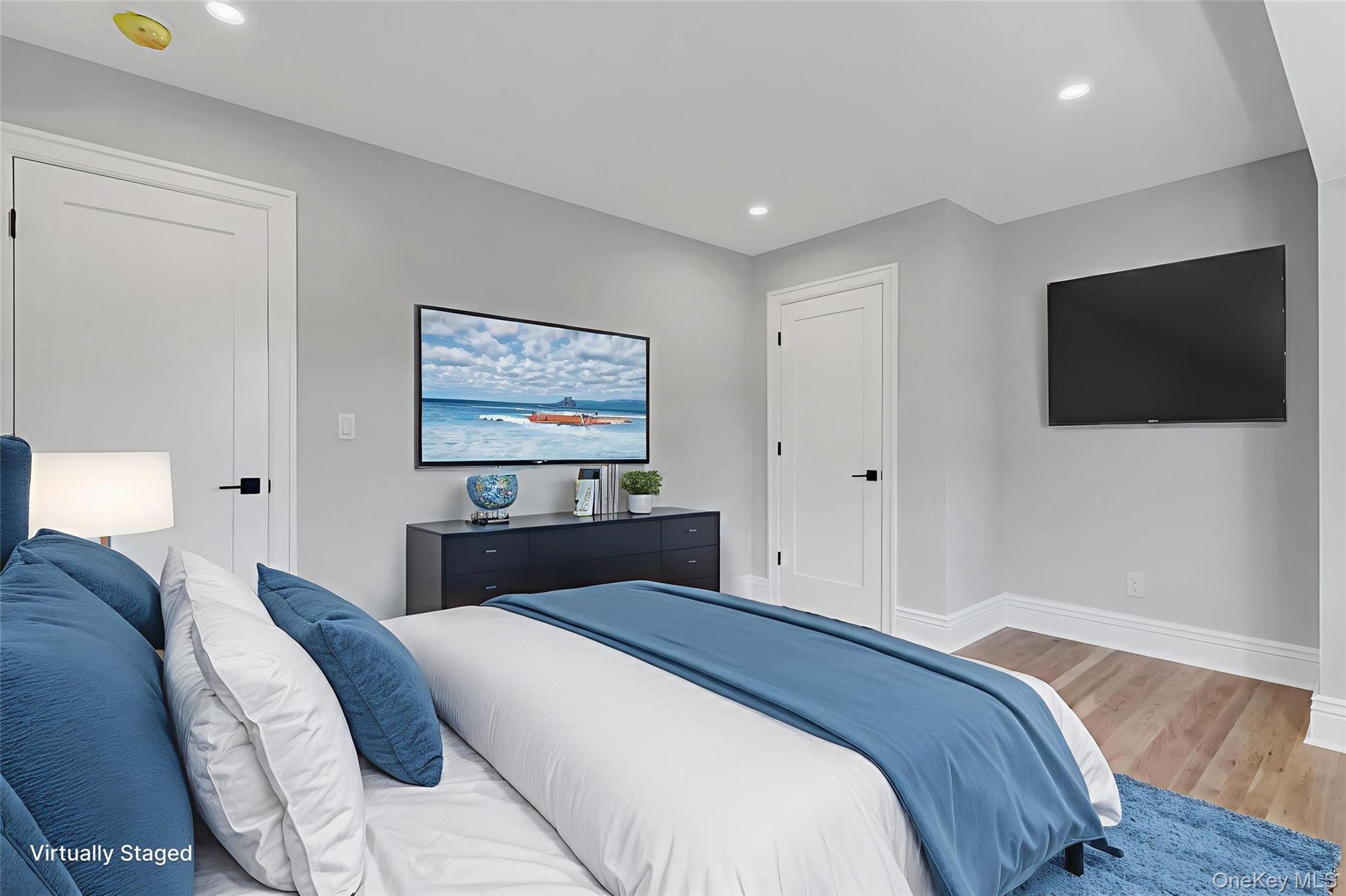 - Bedroom with light wood finished floors, multiple windows, and recessed lighting