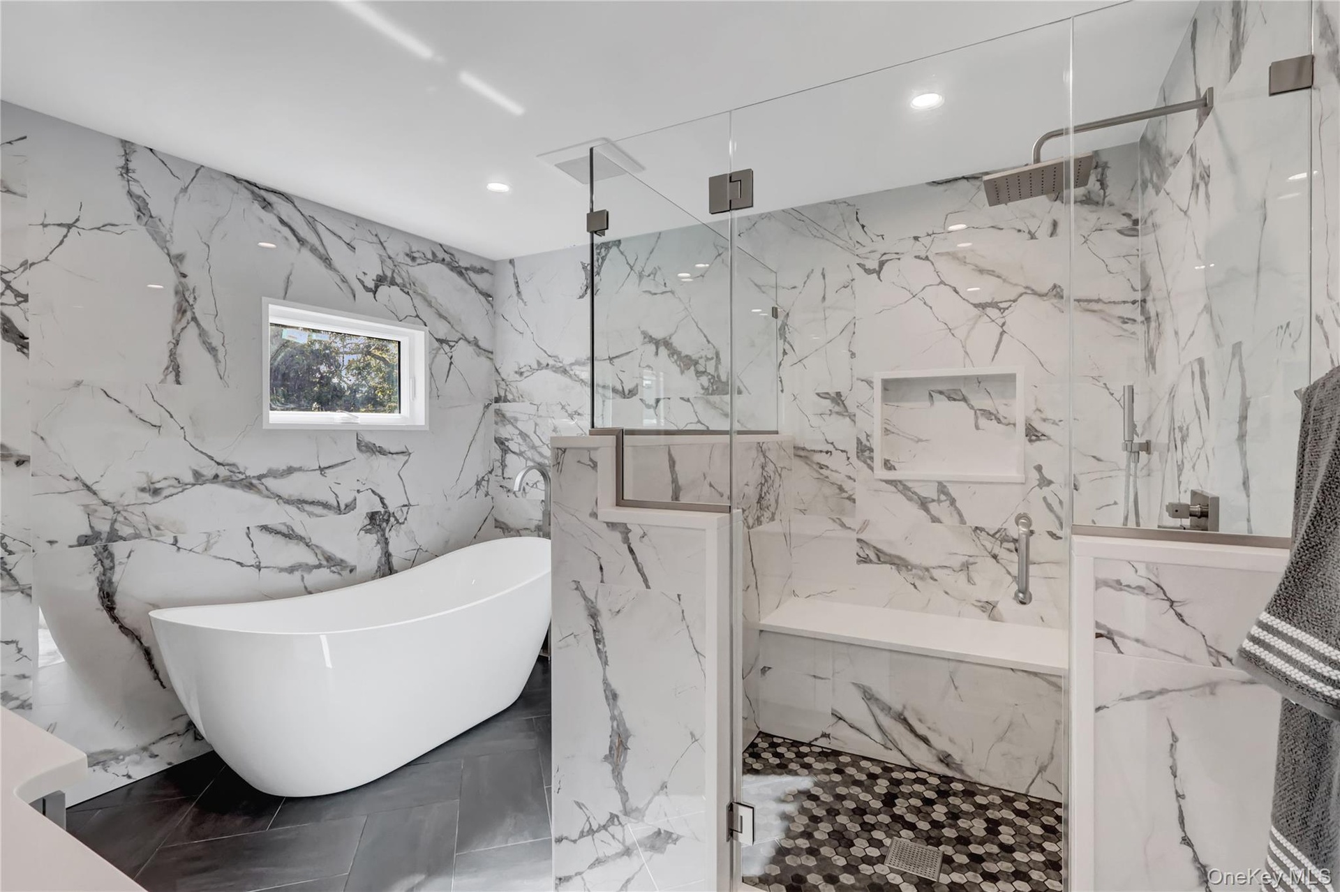 - Bathroom with stone wall, a freestanding tub, a marble finish shower, recessed lighting, and tile walls
