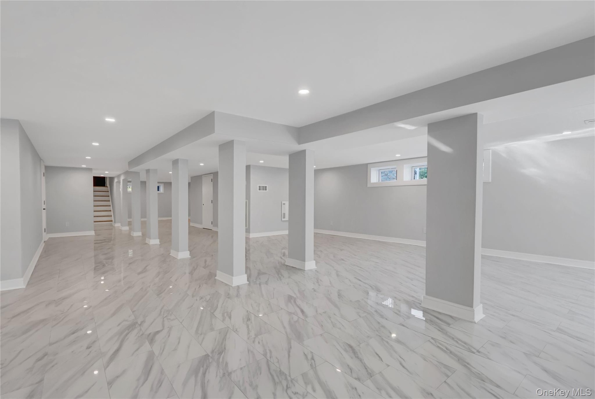 - Below grade area featuring recessed lighting, light marble finish flooring, and stairway