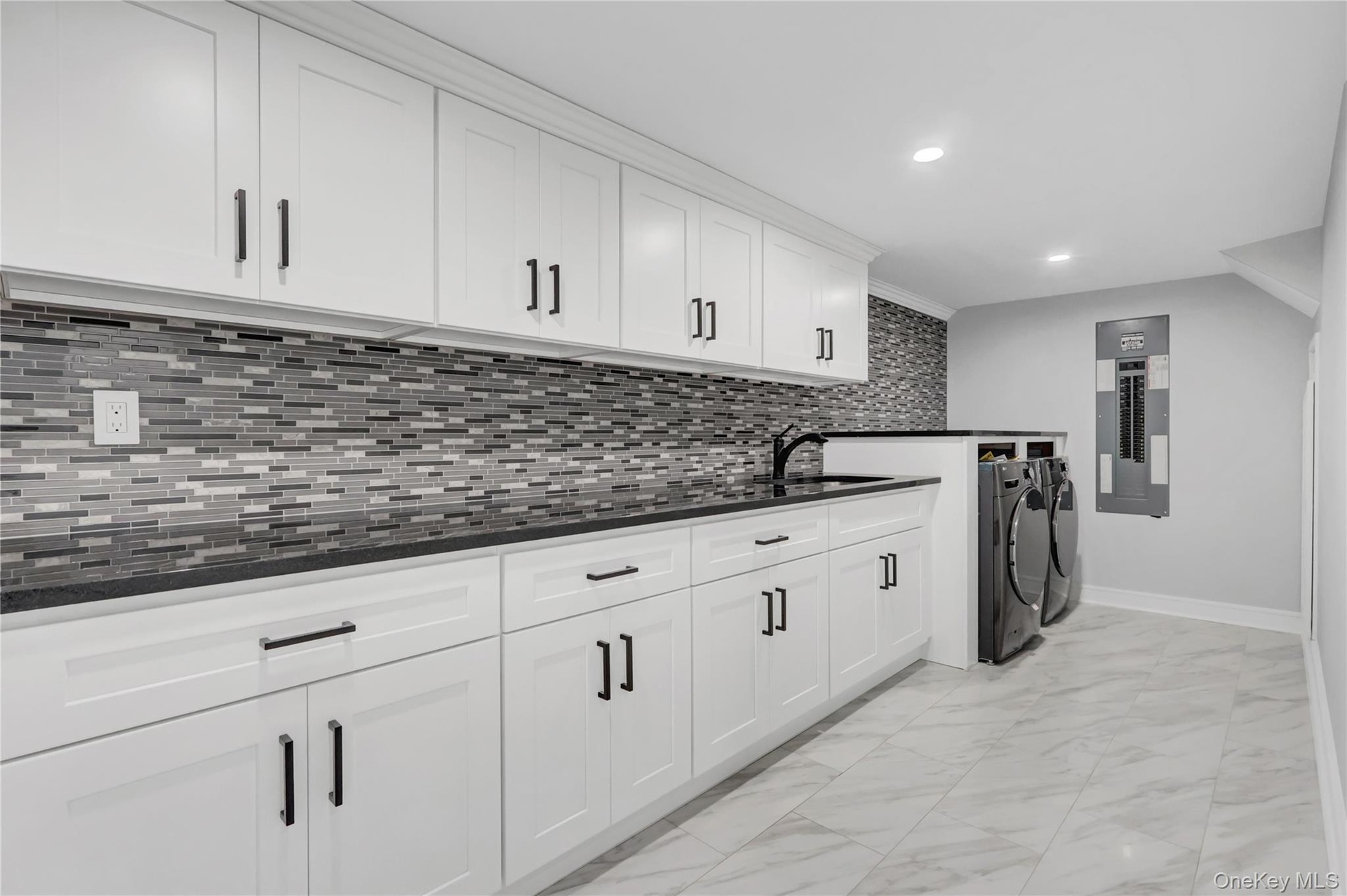 - Laundry area with light marble finish flooring, electric panel, washing machine and dryer, recessed lighting, and cabinet space