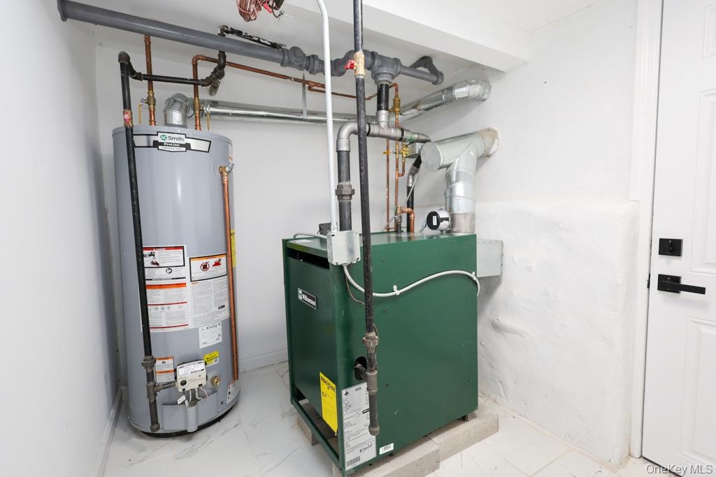 - Utility room featuring gas water heater and a heating unit