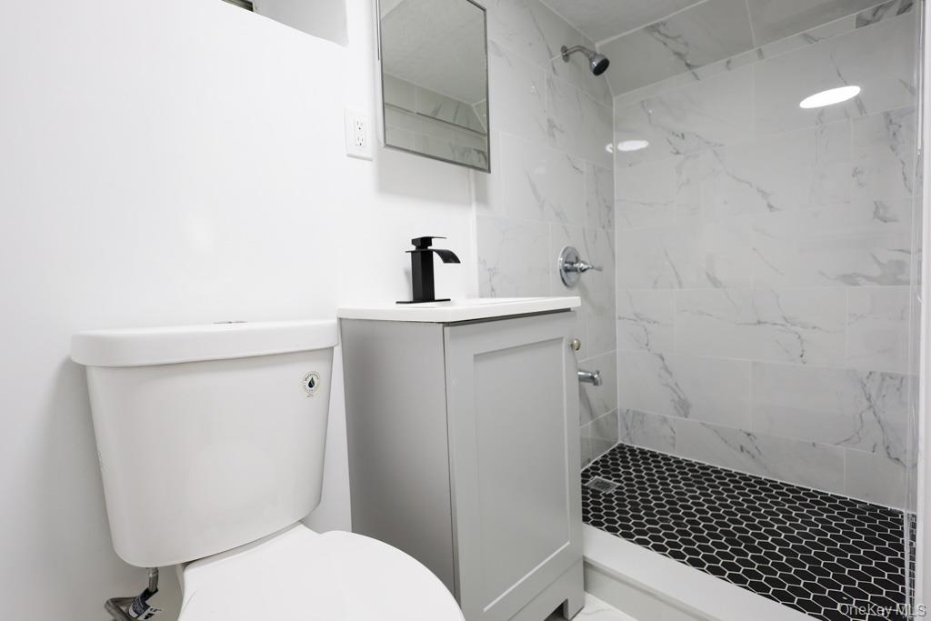- Full bathroom with a marble finish shower and vanity
