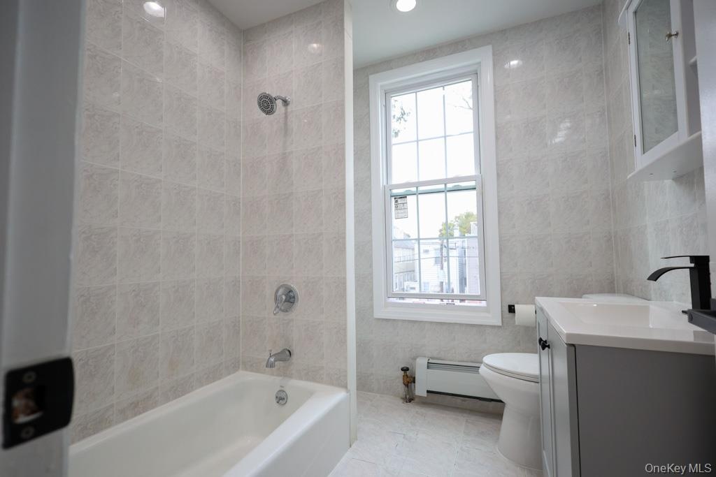 - Full bathroom featuring tile walls, vanity, tub / shower combination, a baseboard heating unit, and recessed lighting