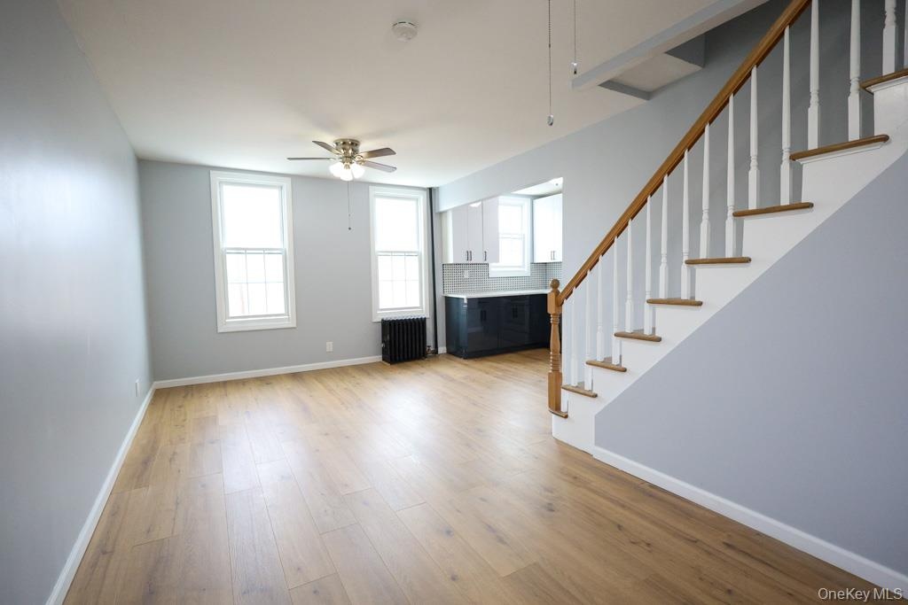 - Unfurnished living room with stairway, light wood-style flooring, a ceiling fan, and radiator