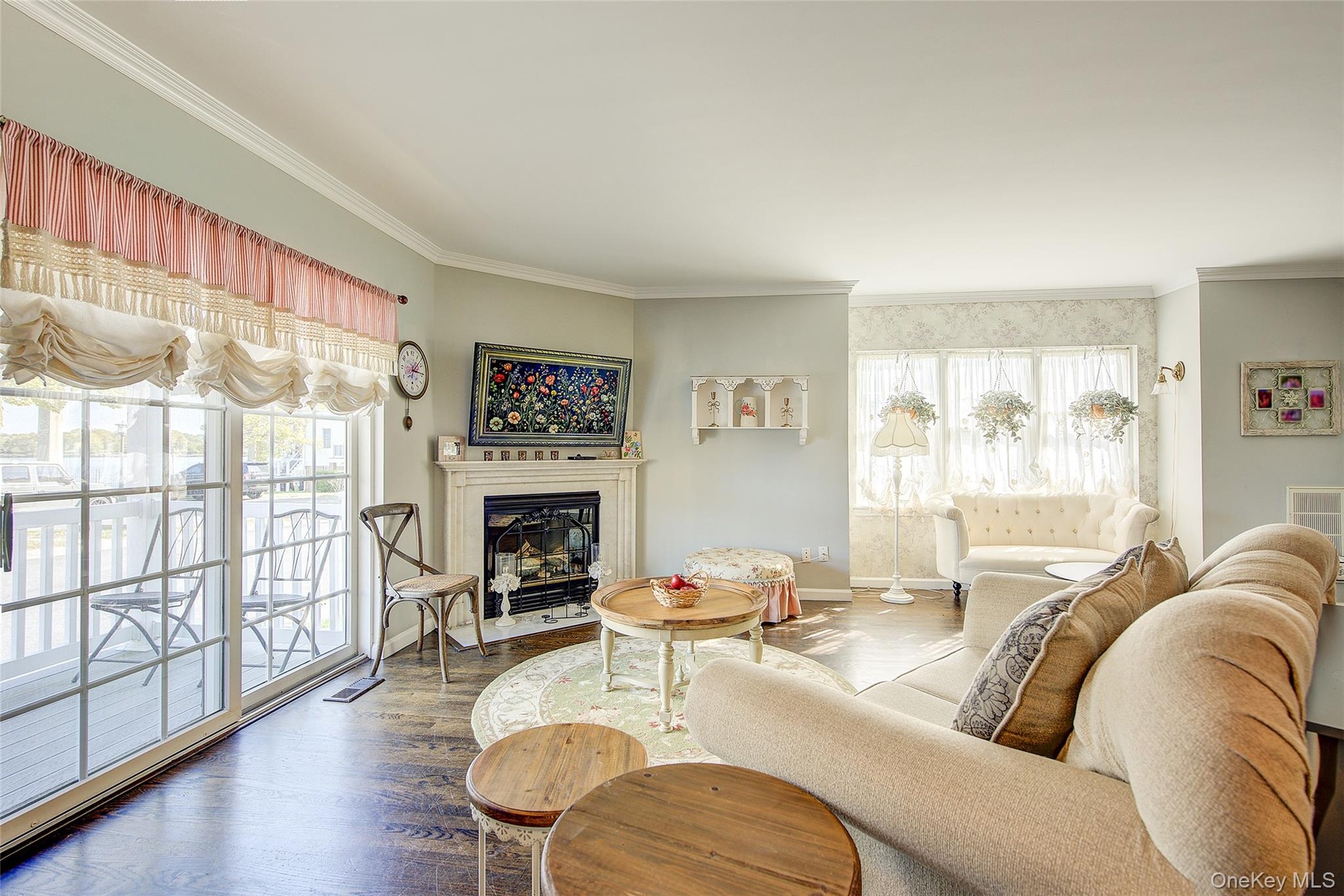 - Living area with a fireplace with flush hearth, ornamental molding, plenty of natural light, and wood finished floors