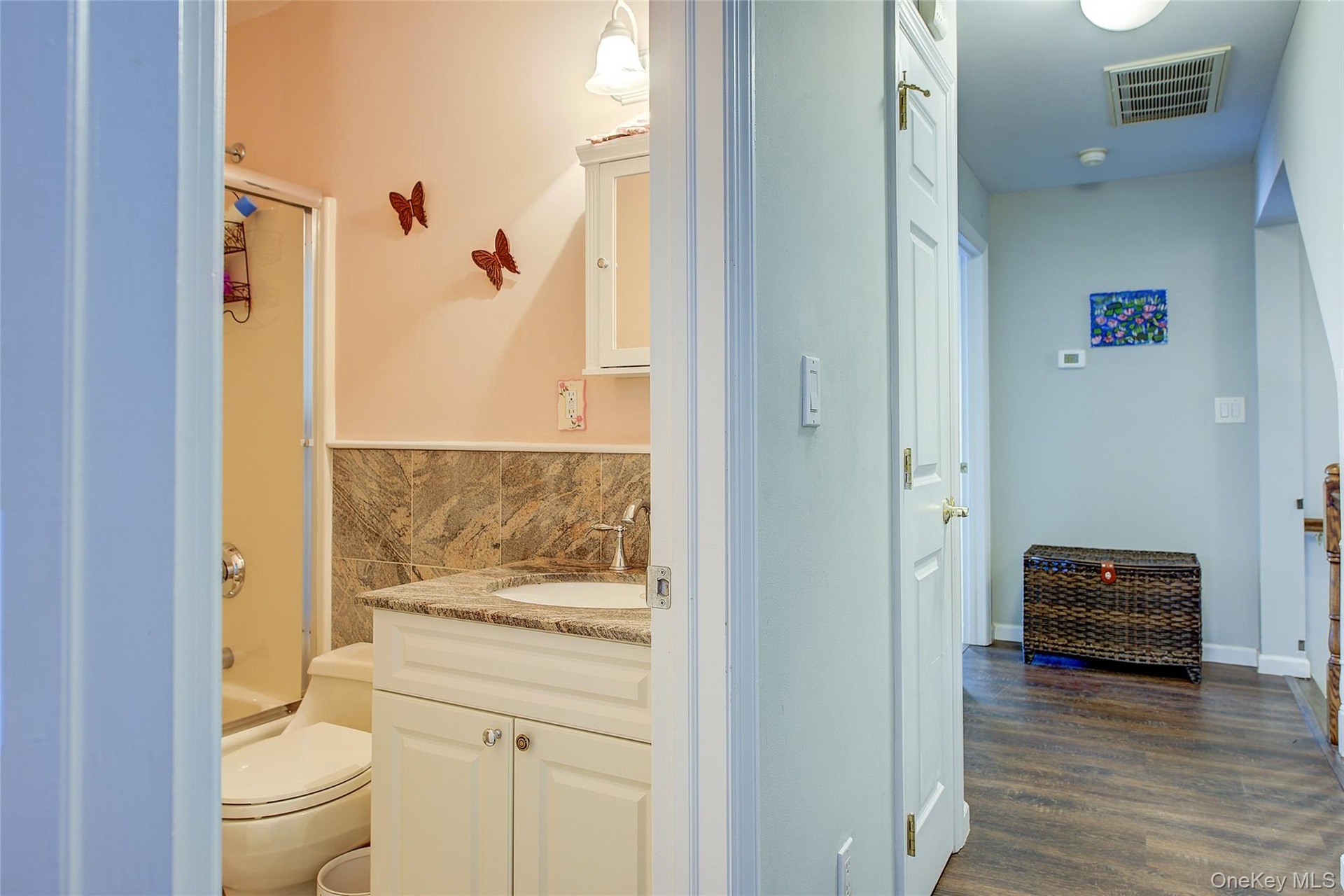 - Full bath featuring vanity, combined bath / shower with glass door, dark wood-style floors, and tile walls