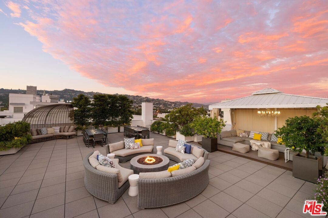 Beverly Hills Penthouse with Private Rooftop Oasis! Indulge in the pinnacle of Beverly Hills luxury on Palm Drive, where this one-of-a-kind penthouse retreat offers over 2,000 sq ft of open-air living space and spectacular 360-degree views of Los Angeles. From Beverly Hills and Century City to the Hollywood Hills, Bird Streets, and Griffith Park Observatory, every sunset and skyline moment is yours to savor. With direct elevator access to both the penthouse and rooftop, this residence ensures privacy, sophistication, and ease at every turn. The rooftop "living room in the sky" is designed for unforgettable entertaining, featuring manicured gardens, fruit trees, an outdoor spa, cabana dining, fire pit, and a full gourmet kitchen with expansive barbecue area. Inside, the 3-bedroom, 3.5-bath penthouse combines elegance with modern convenience: Expansive windows and a massive sliding door system connect the large balcony and living room for seamless indoor-outdoor living. A spacious great room with open dining and lounge areas anchors the home, complemented by a custom-crafted bar, hardwood floors, wine fridge, and immersive surround sound. The Miele-appointed kitchen features built-in plumbed coffee and filtered water systems, paired with bespoke cabinetry and sleek finishes. The master suite is flanked by two private bedroom suites, each with its own ensuite bath and closet for exceptional privacy. A custom-designed walk-in closet enhances the master suite. An additional bonus space functions as a private office or dressing room. Every detail has been curated for refined comfort: automated drapes, custom-designed closets, glass shelving, and a discreet owner's lobby with singular elevator access. The building provides full-service amenities, including: 24-hour concierge and security, Fitness center and owner's lounge. Three secure side-by-side parking spaces with EV charging, Wine closet and additional garage-level storage. Perfectly located in the heart of Beverly Hills, the residence offers the rare luxury of peace and privacy while being just moments from Bristol Farms, and the world-renowned shops and dining of Rodeo Drive. This is not simply a penthouse it is an irreplaceable lifestyle, elevating Beverly Hills living to its highest level.