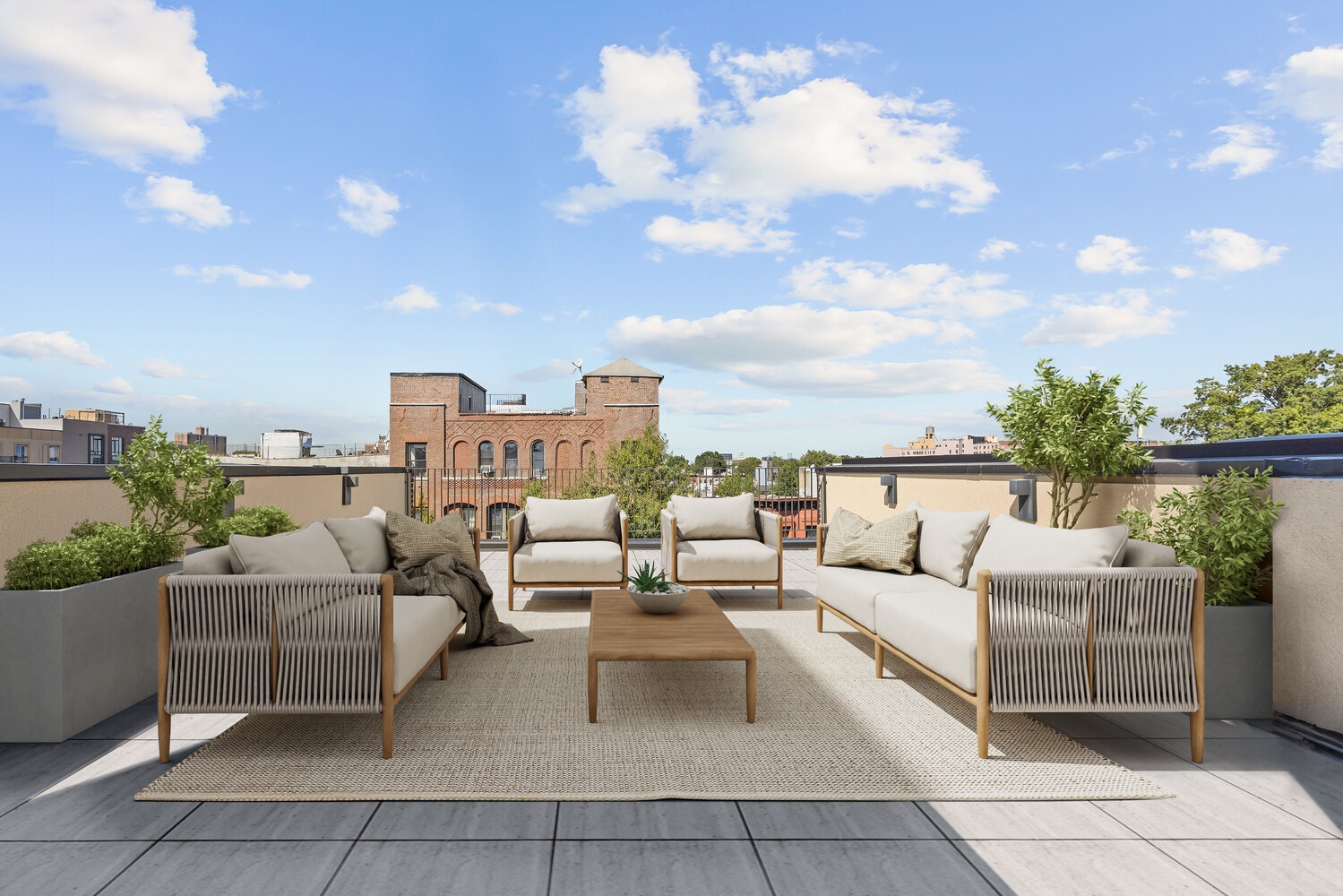 Crowning the building, the penthouse occupies the entire fourth floor. This three-bedroom, two-bathroom home includes 590 square feet of private outdoor living across two balconies and a spacious roof deck-perfect for hosting gatherings or enjoying panoramic Brooklyn views.