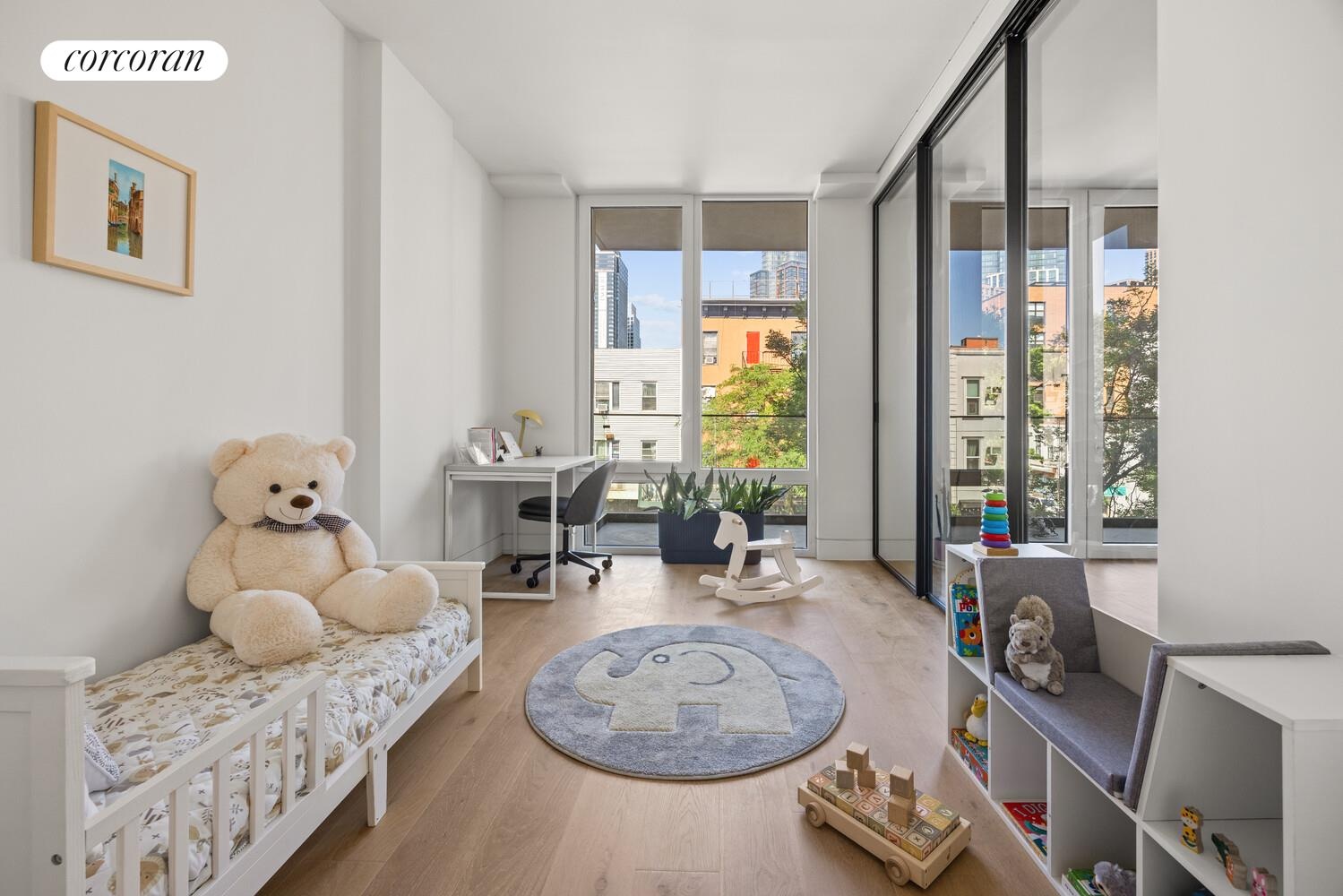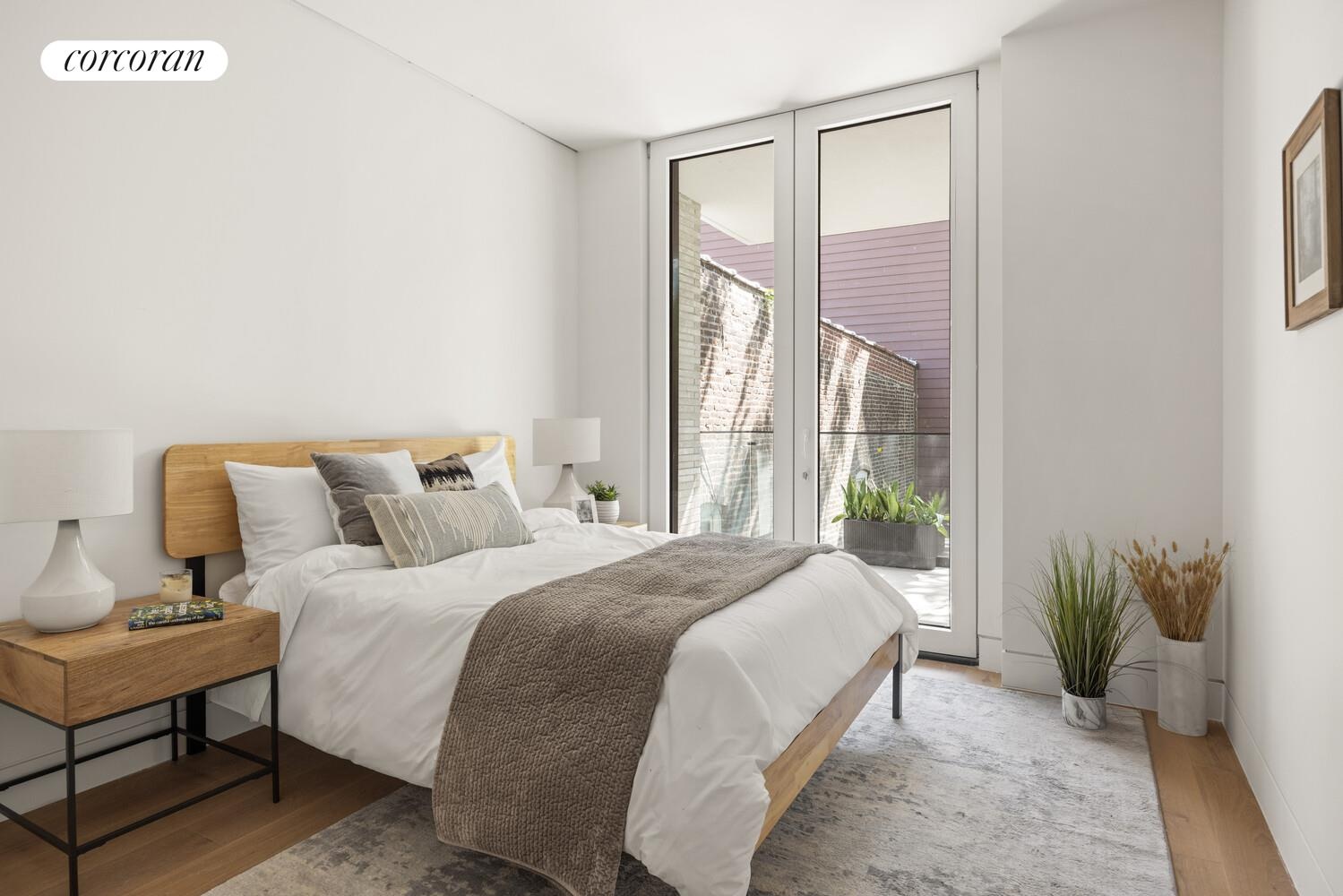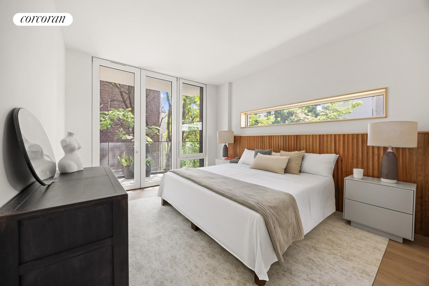 Accessed from the living room, one of the three large bedrooms features floor-to-ceiling windows with views of Manhattan Avenue. With a spacious double closet, stylish pendant lighting, and space for a Queen or King bed- this room can serve as a third bedroom, a dedicated home office, or a seamless extension of your living area. A modern glass paneled sliding wall allows you to easily open the space for a more integrated layout or close it off for added privacy.