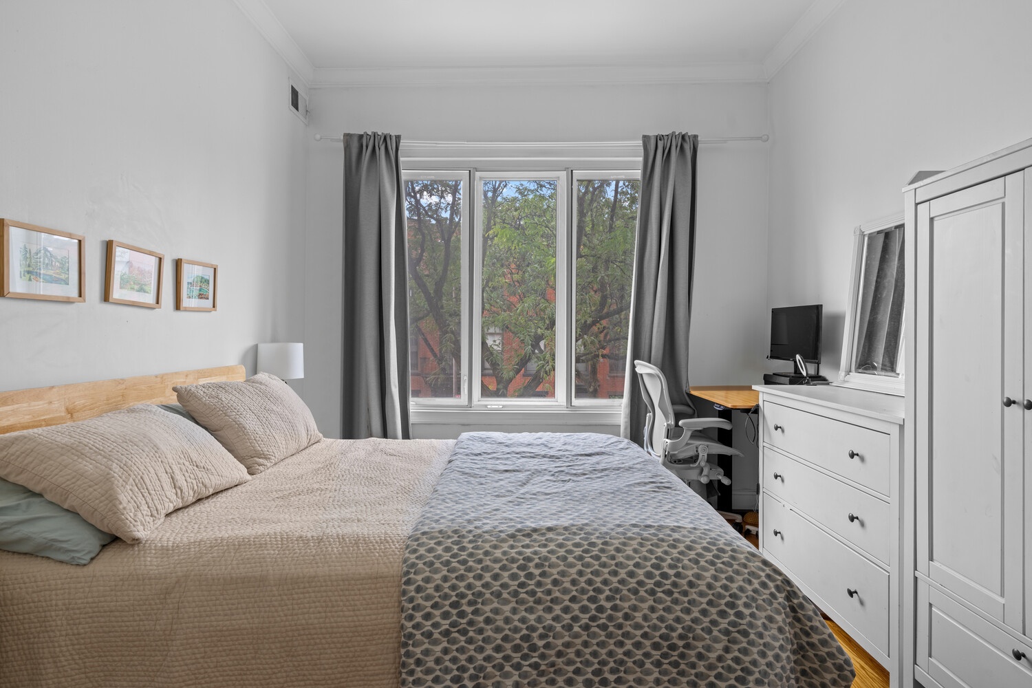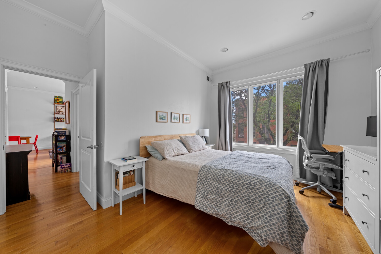 The well-planned layout features double-pane windows in both bedrooms, ensuring peace and quiet. The contemporary kitchen is outfitted with premium appliances, including a GE dishwasher, a Frigidaire stove, and a Frigidaire refrigerator. Both bathrooms showcase upscale finishes that combine sophistication with practicality, featuring sleek fixtures, spa-style tilework, and modern vanities. There is an in-unit washer and dryer complemented by a private storage area right outside the apartment, enhancing the home's functionality.