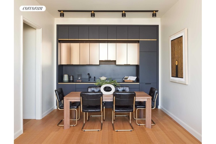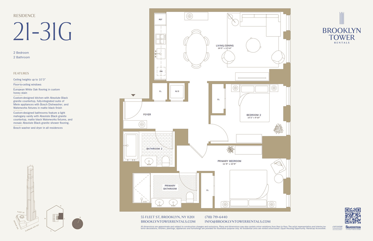 Rental residence 27G is a breathtaking 2bdrm layout featuring 10" lofty ceilings and full height windows which flank the open space offering an unparalleled eastern exposure of The Brooklyn landscape and Fort Greene Park. European white oak flooring in custom honey stain align the residence creating and indulgent warmth. Brooklyn Tower features custom designed kitchens by Gachot Studios with Absolute Black granite countertops, fully integrated suite of Miele appliances with Bosch dishwasher and Waterworks fixtures in matte black finish. Bathroom suites showcase custom-designed details with light mahogany vanities and dolomite stone throughout.