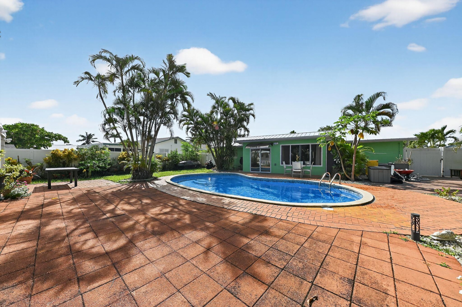 Welcome to this beautifully renovated and fully furnished 3-bedroom, 2-bathroom home for lease, nestled on a quiet cul-de-sac in Jupiter. Recently updated with a brand-new roof and fresh exterior paint (2024), this residence is move-in ready and designed for comfort and style. Inside, you'll find a bright and welcoming layout with hurricane-impact windows, elegant finishes, and thoughtful upgrades. The master bathroom features a travertine shower, while the second bathroom is accented with slate tile. A lovely Florida room provides the perfect spot to relax or entertain year-round. Outdoors, the lush backyard is a private retreat with a sparkling pool and ample space for entertaining under the Florida sun. The extended driveway offers plenty of parking, and