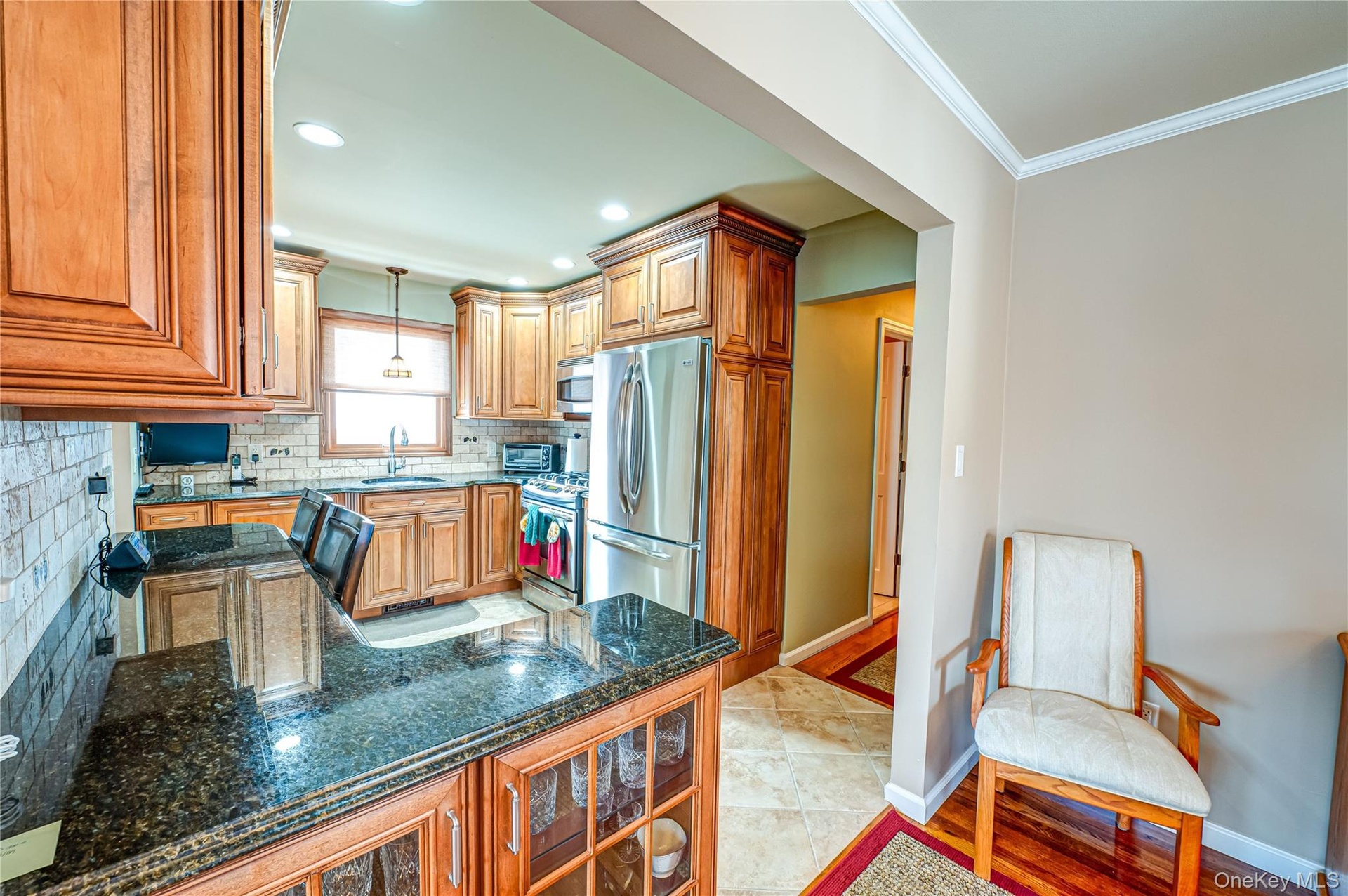 - Kitchen featuring crown molding, appliances with stainless steel finishes, decorative backsplash, dark stone counters, and brown cabinets