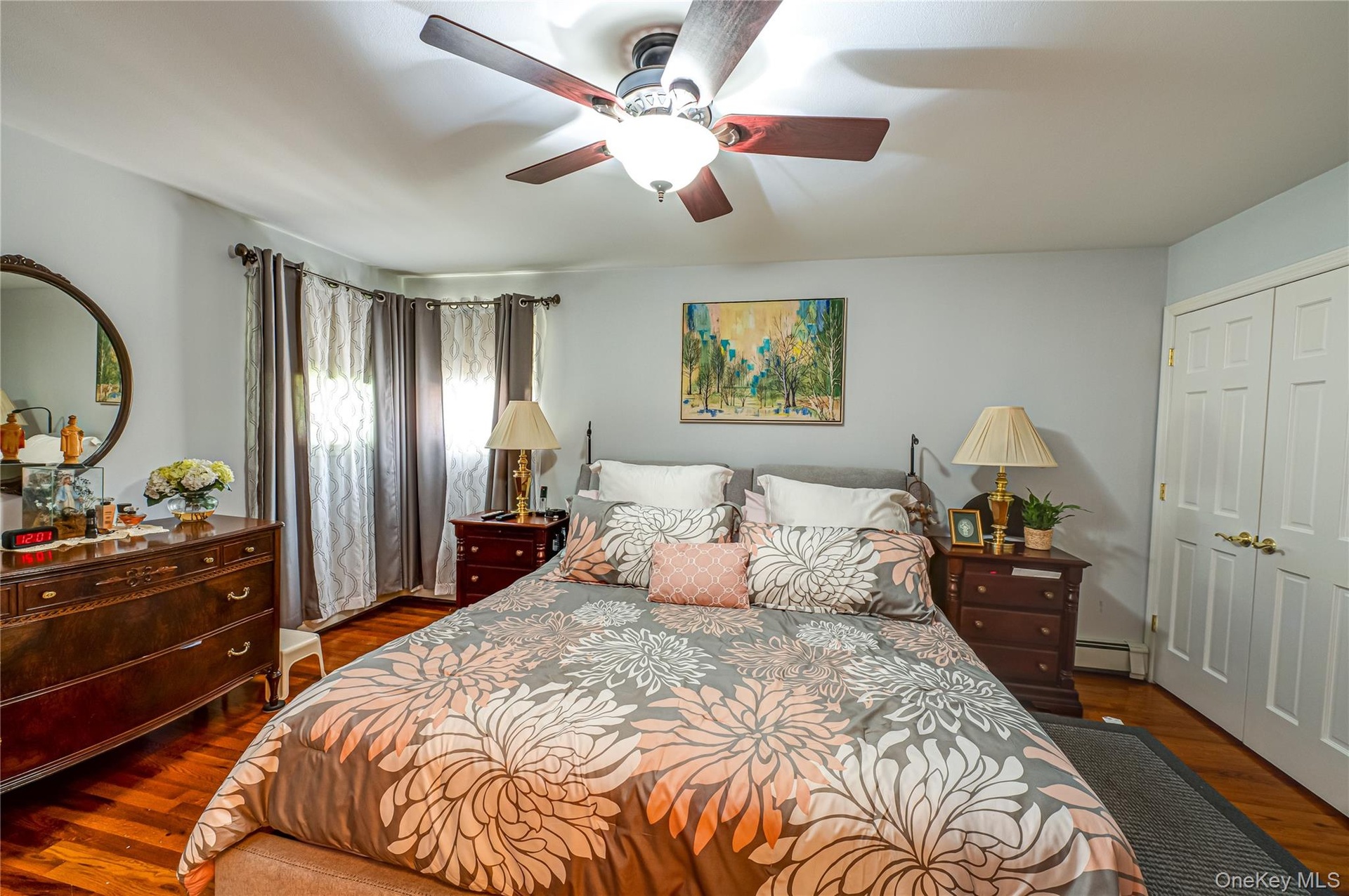 - Bedroom featuring dark wood-type flooring, a ceiling fan, a baseboard radiator, and a closet