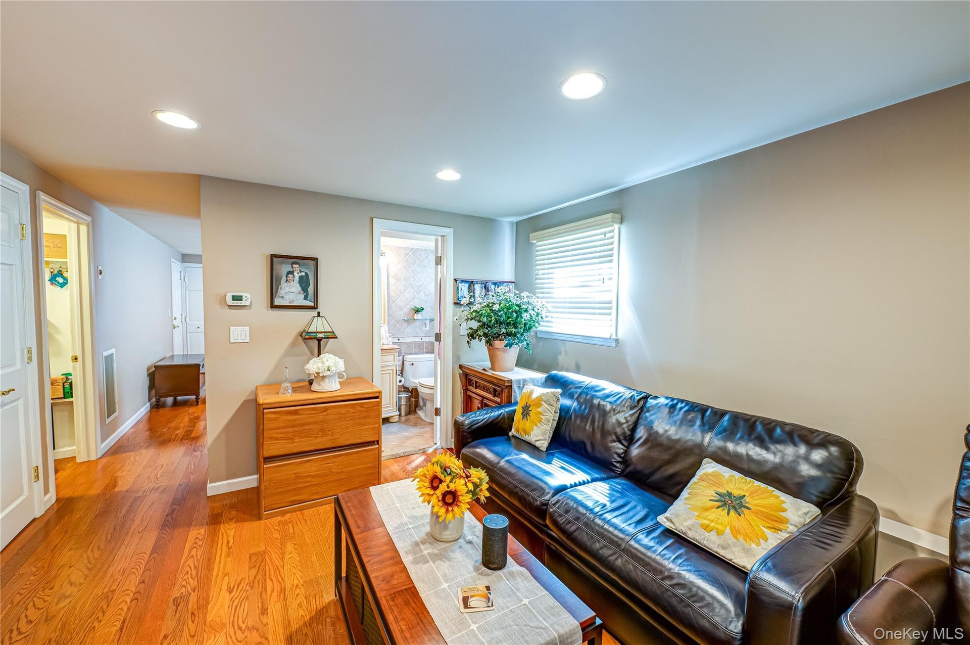 - Living area featuring wood finished floors, crown molding, and recessed lighting