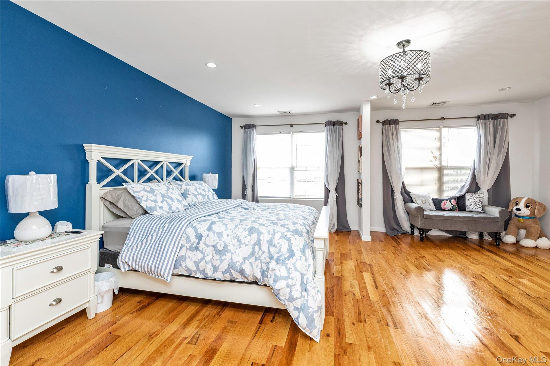 - Bedroom with wood finished floors, a chandelier, and recessed lighting