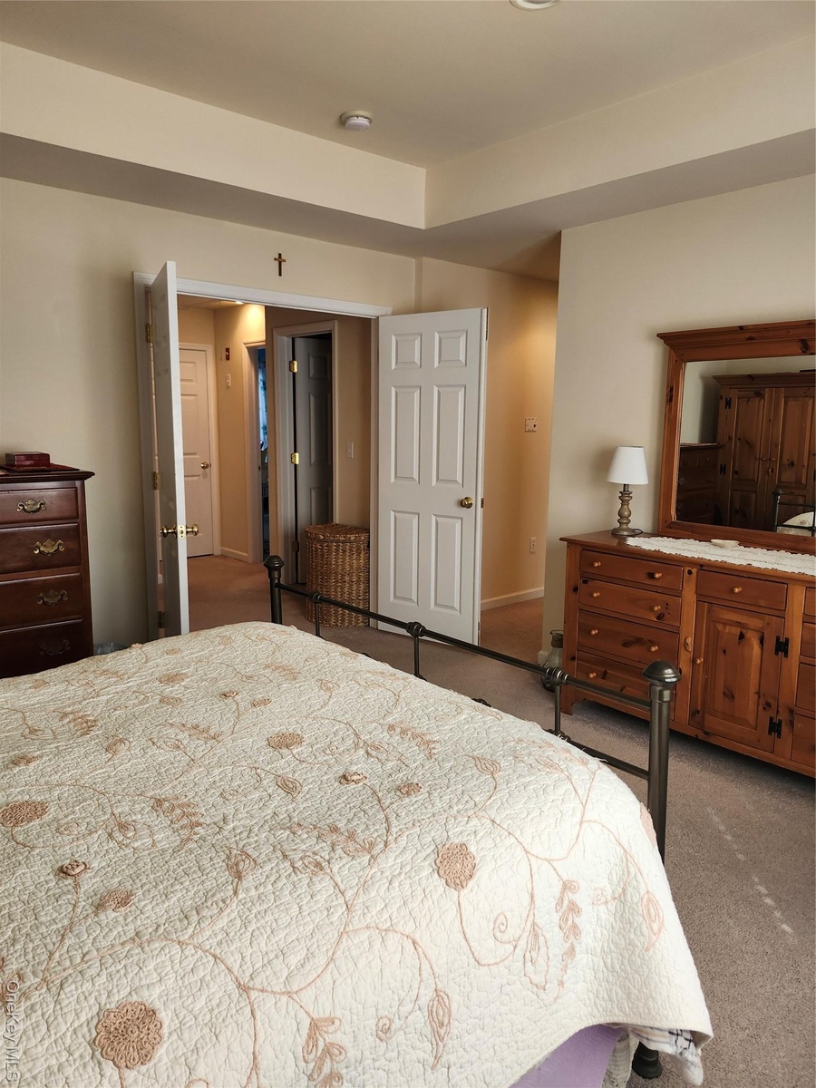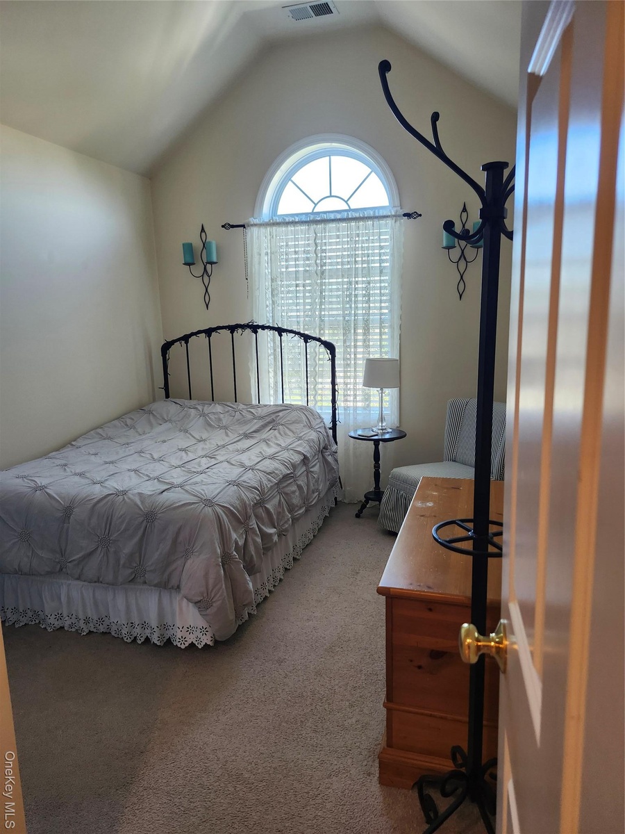 - Carpeted bedroom with lofted ceiling