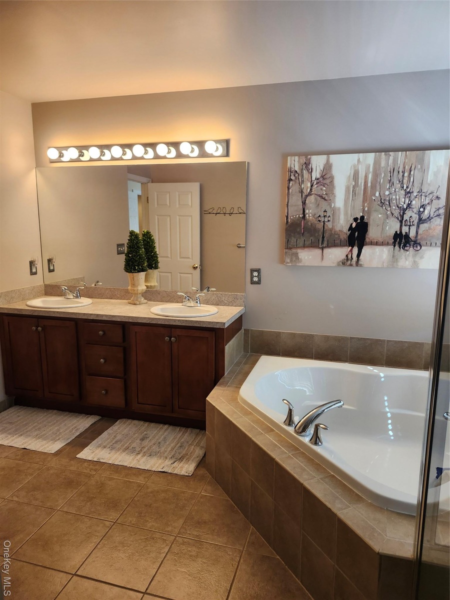 - Full bathroom featuring a garden tub, double vanity, and tile patterned floors