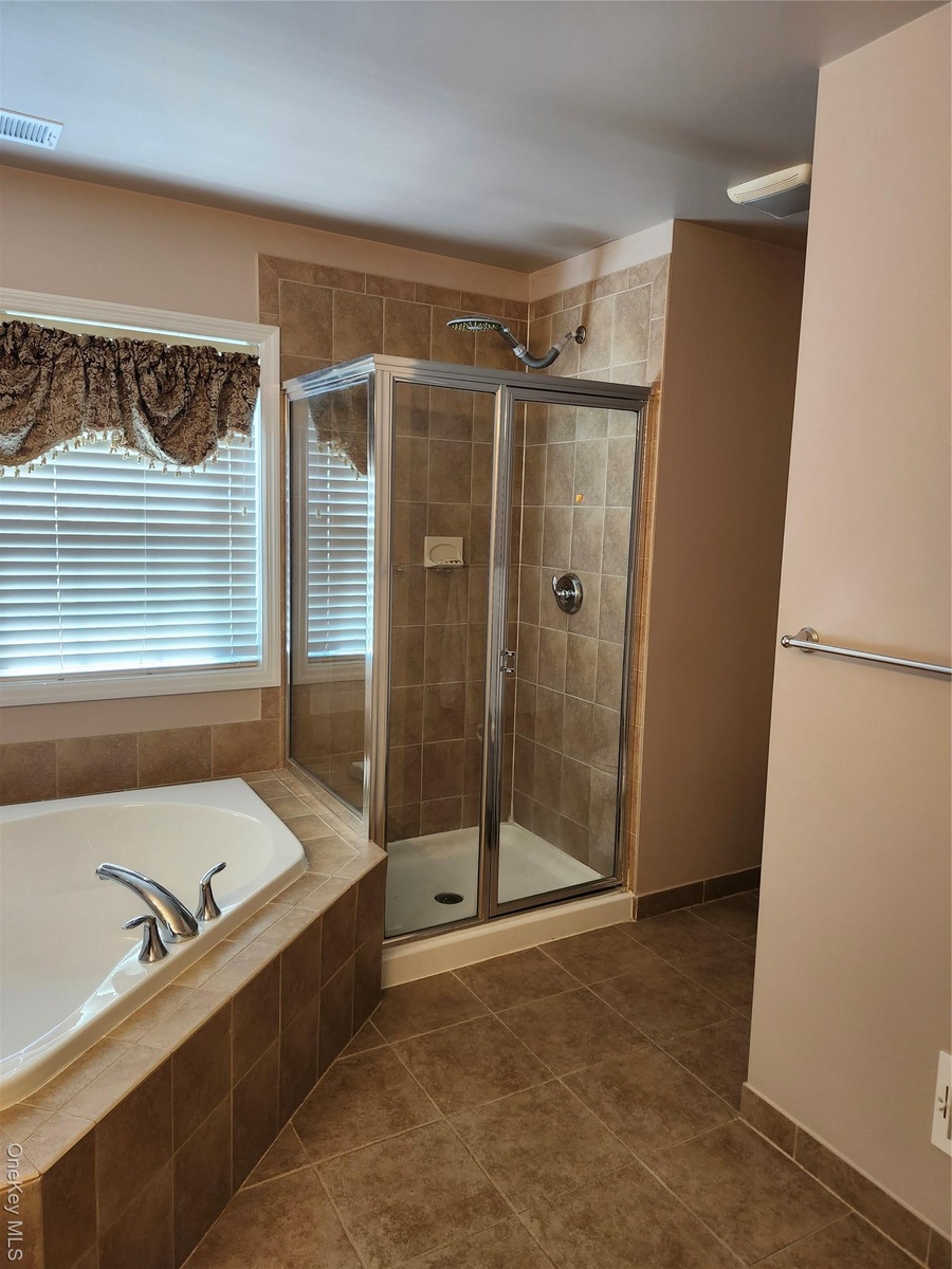 - Full bathroom featuring tile patterned flooring, a stall shower, and a bath