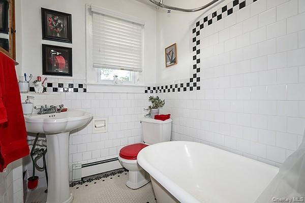 - Bathroom with a freestanding tub, a baseboard heating unit, tile patterned flooring, and tile walls