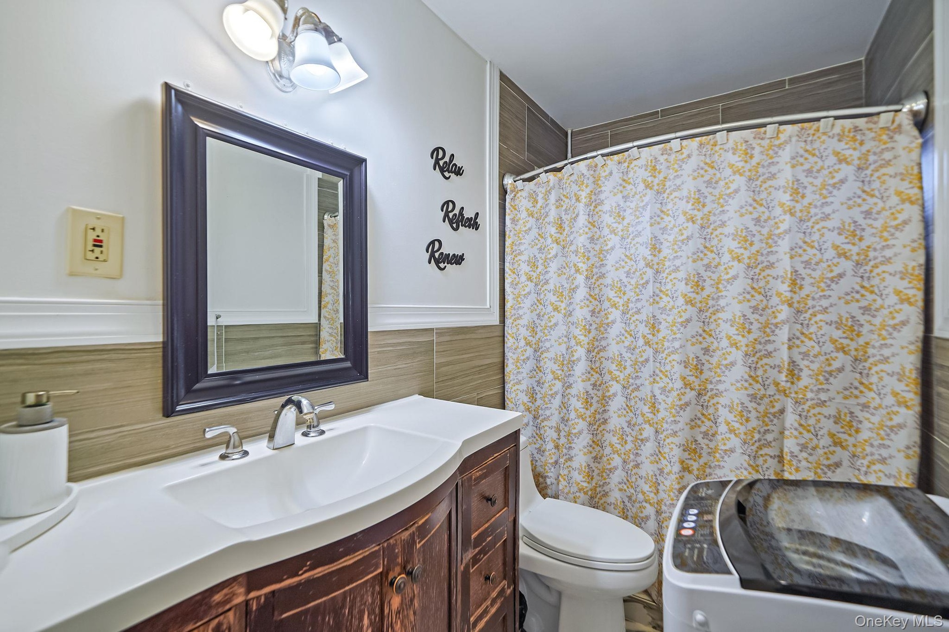 - Bathroom with vanity, tile walls, curtained shower, and a wainscoted wall