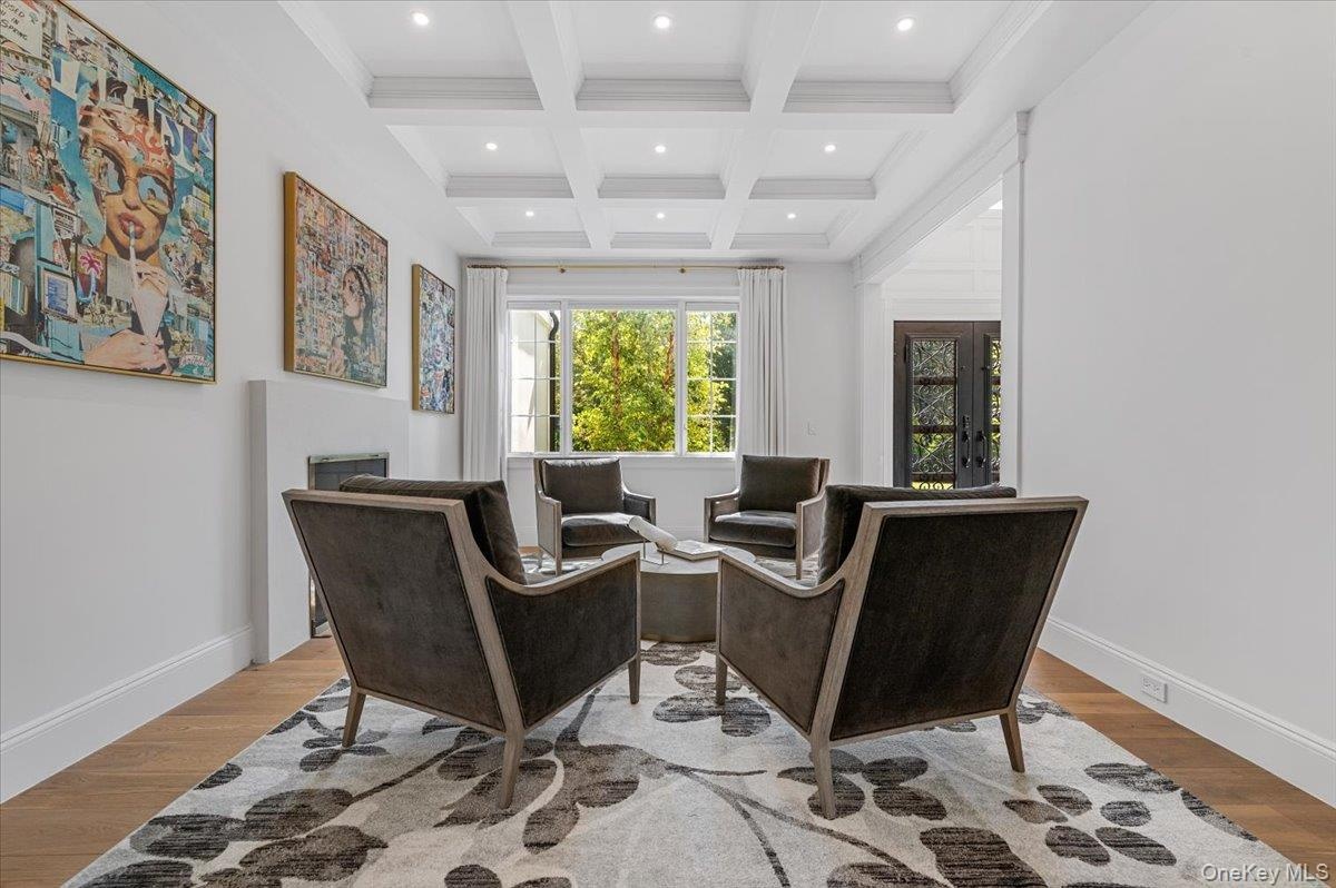 - Living area with hardwood / wood-style flooring, coffered ceiling, beam ceiling, and recessed lighting