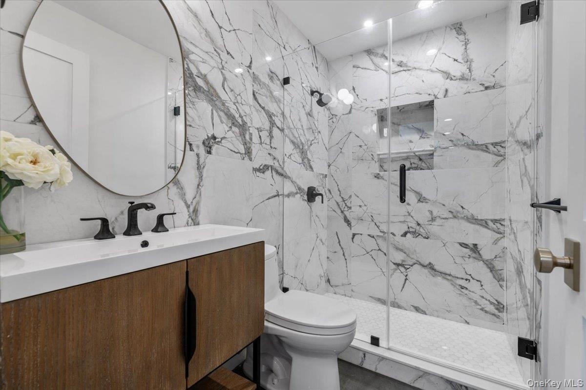 - Bathroom featuring vanity, a marble finish shower, tile walls, and recessed lighting
