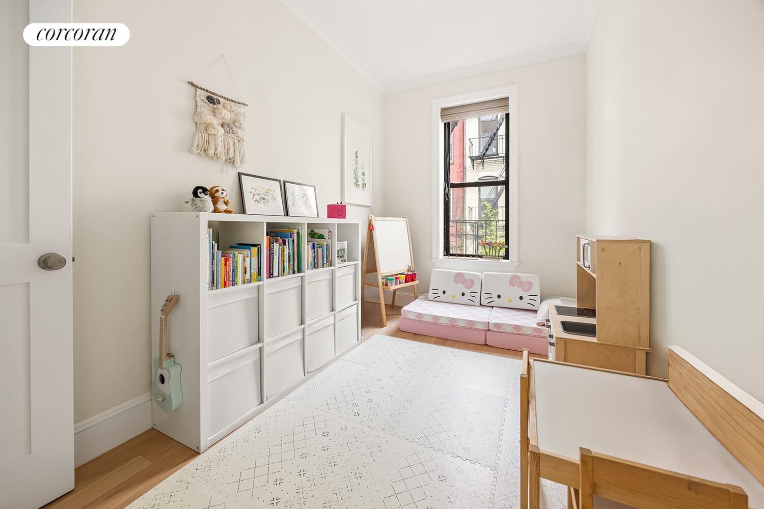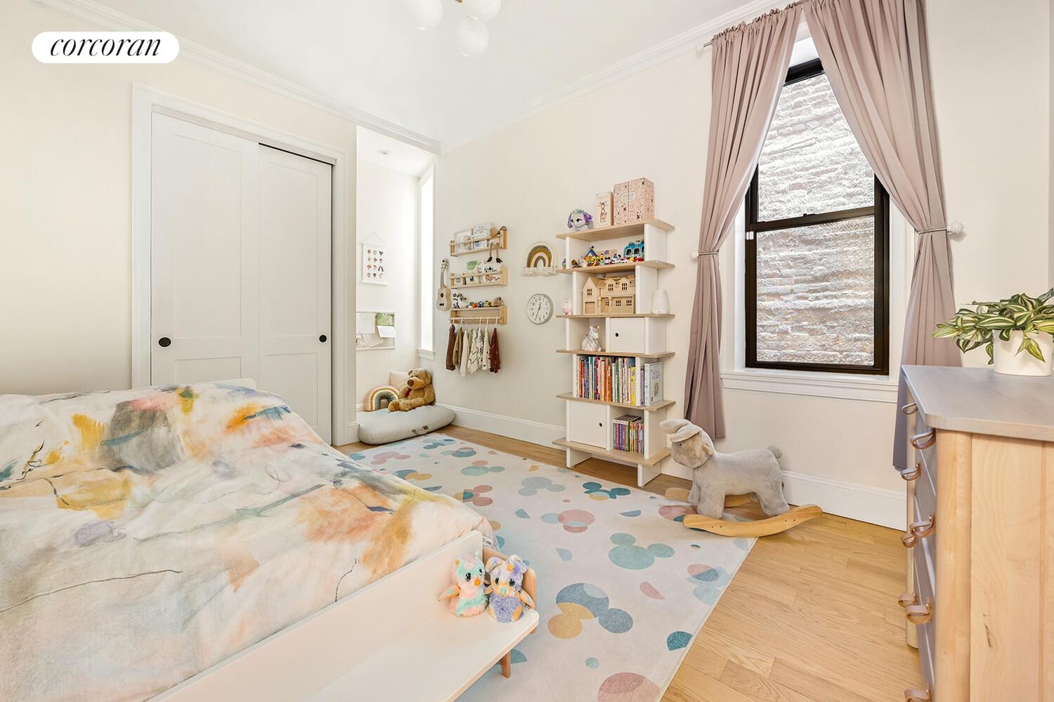 This beautifully appointed 3-bedroom, 2-bathroom condominium encompasses an entire floor-nearly 1,500 square feet-of a striking townhouse in central Park Slope. Upon entry, a spacious foyer welcomes you with ample room for storage and seating, setting the tone for the thoughtful design throughout.