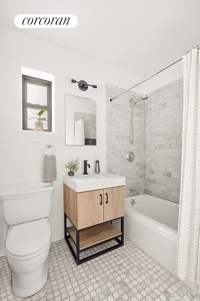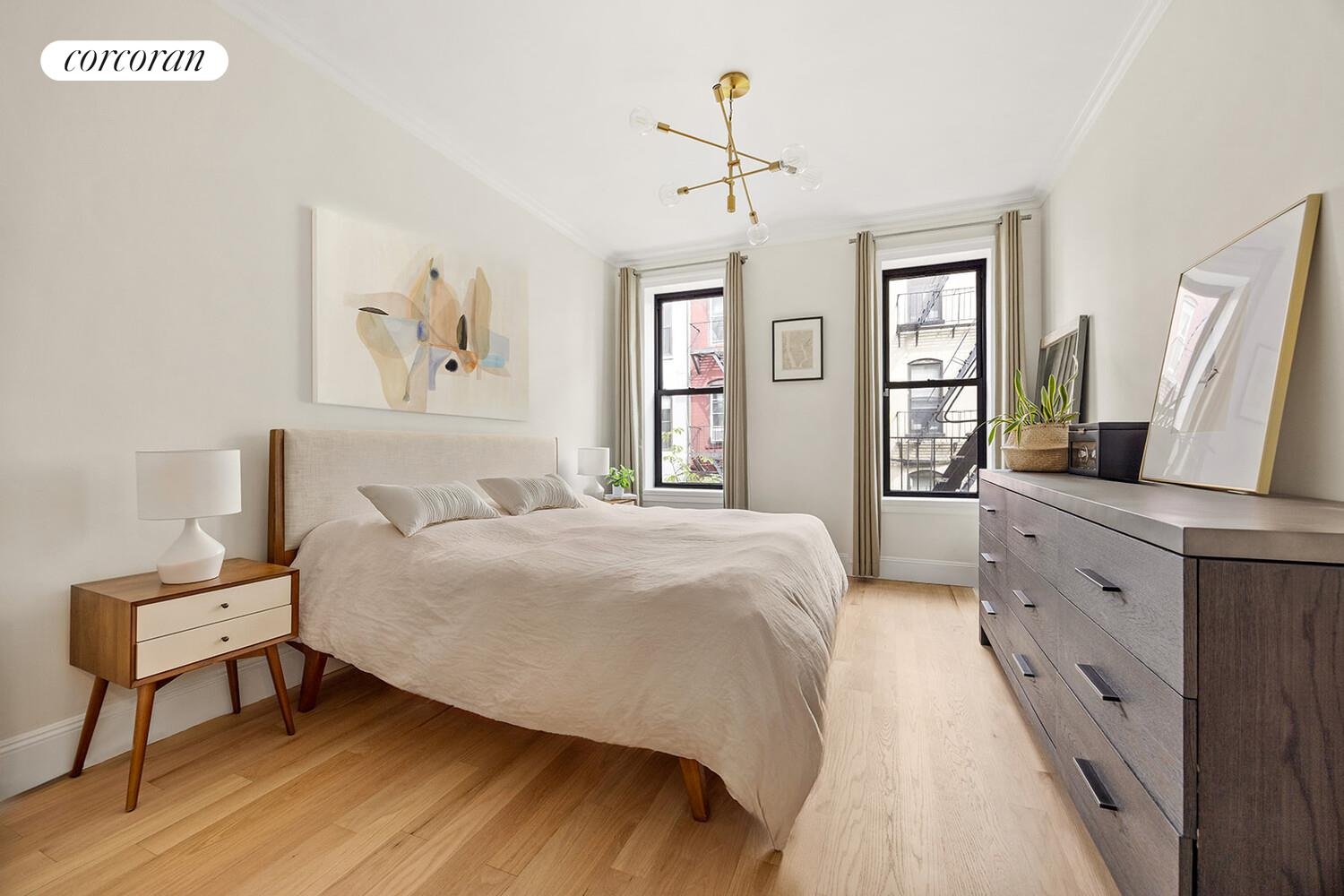 The private bedroom wing offers a peaceful retreat from city life. Two comfortably proportioned secondary bedrooms each accommodate queen beds with space for additional furniture, perfect for a home office or guest room. The full hallway bathroom showcases luxurious fixtures, marble finishes, and radiant heated floors.