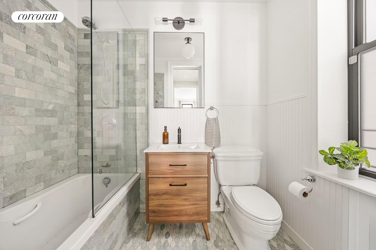 The serene primary suite overlooks the garden with two oversized windows that bathe the room in natural light. Spacious enough for a king bed plus seating area, the room features custom built-in closets leading to the spa-like en-suite bathroom. This luxurious space boasts a Jacuzzi tub, natural marble, designer fixtures, and radiant heated flooring.