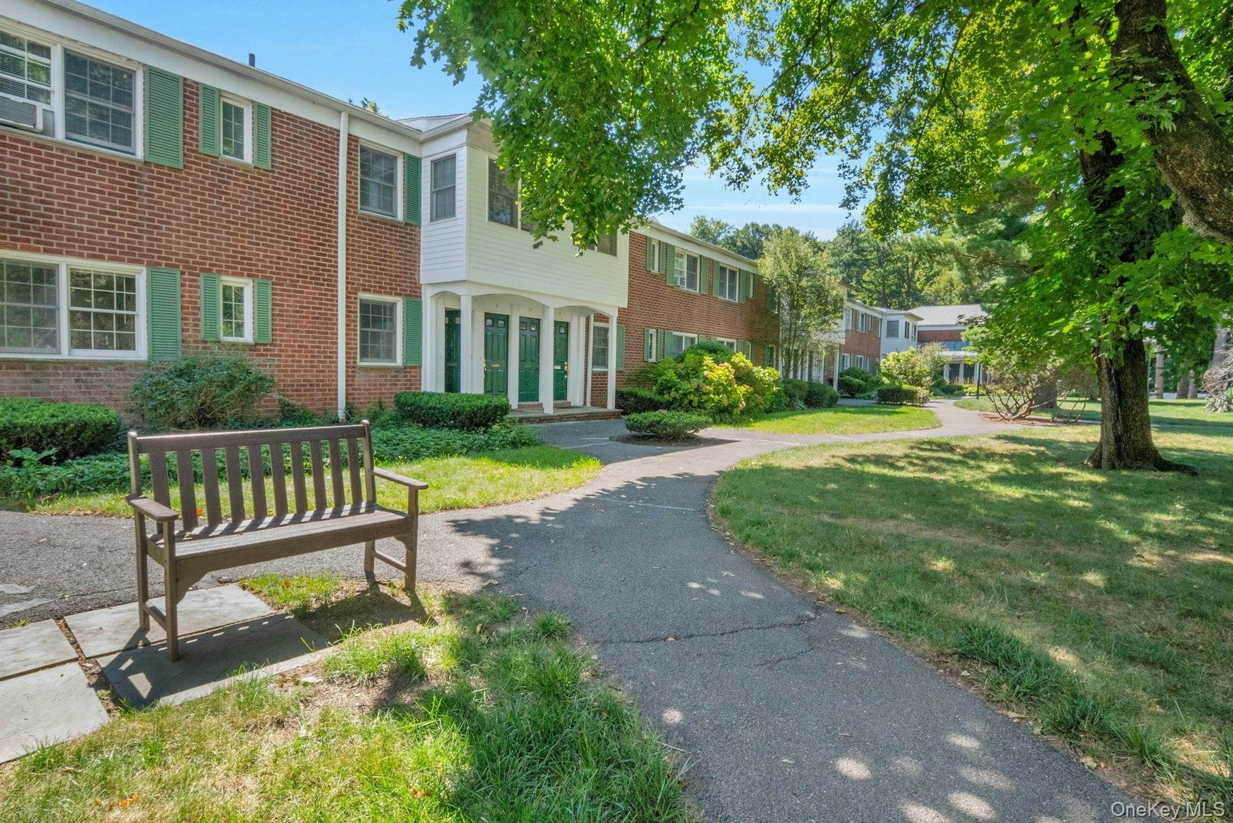 - Greenwood Condominium Pleasantville. Courtyard with bench and surrounded by landscaped green-space and Mature Trees and beautiful plantings
