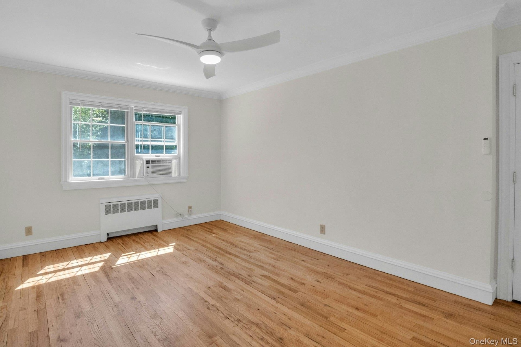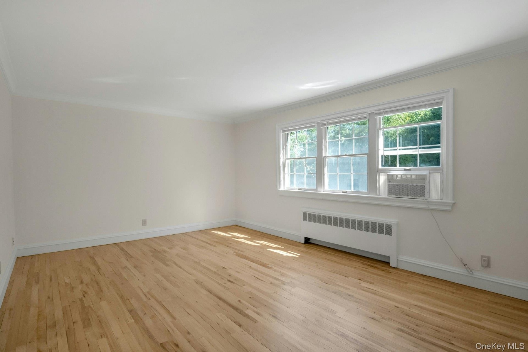 - Bright spacious living room hardwood floors and ornamental molding