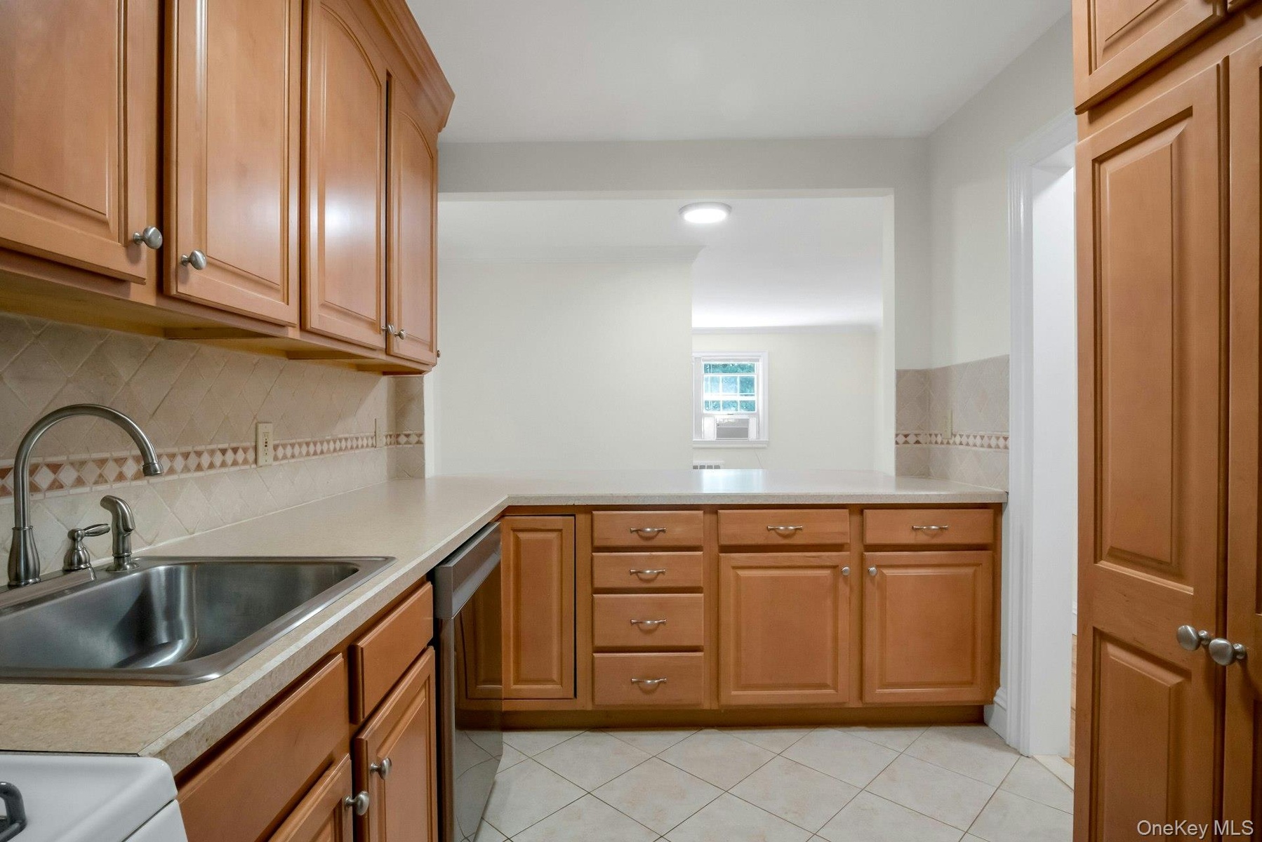 - Kitchen entry with cabinetry and plenty of counter space. Living room in the far background