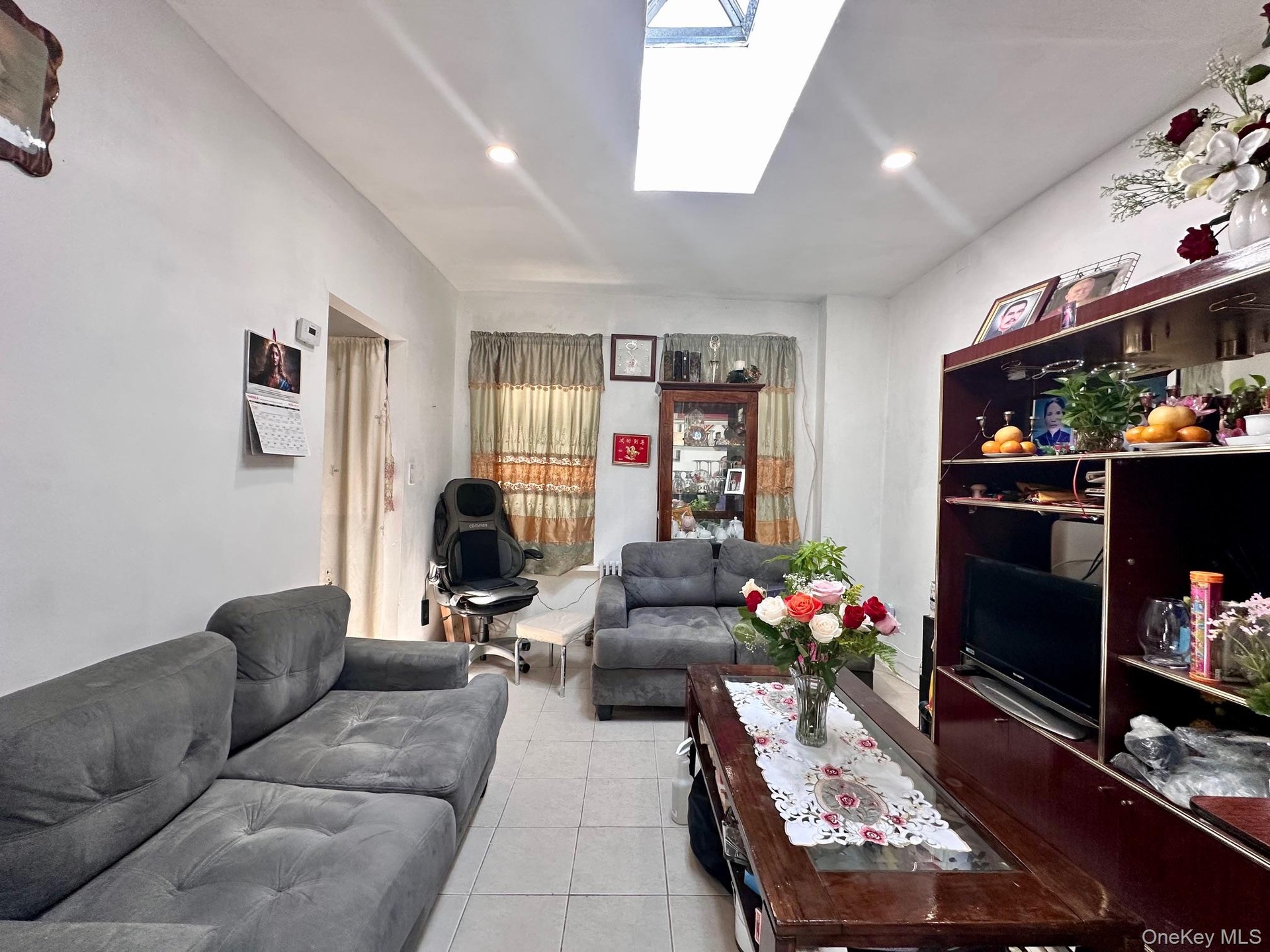 - Living room with a skylight, light tile patterned floors, and recessed lighting
