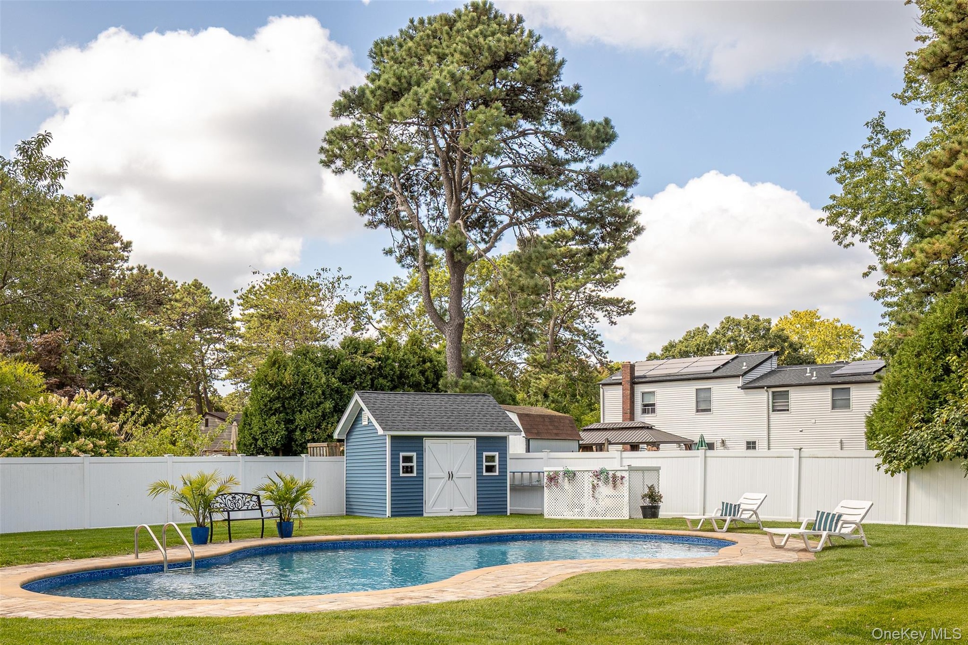 - View of swimming pool featuring a fenced backyard, a patio area, and a storage unit