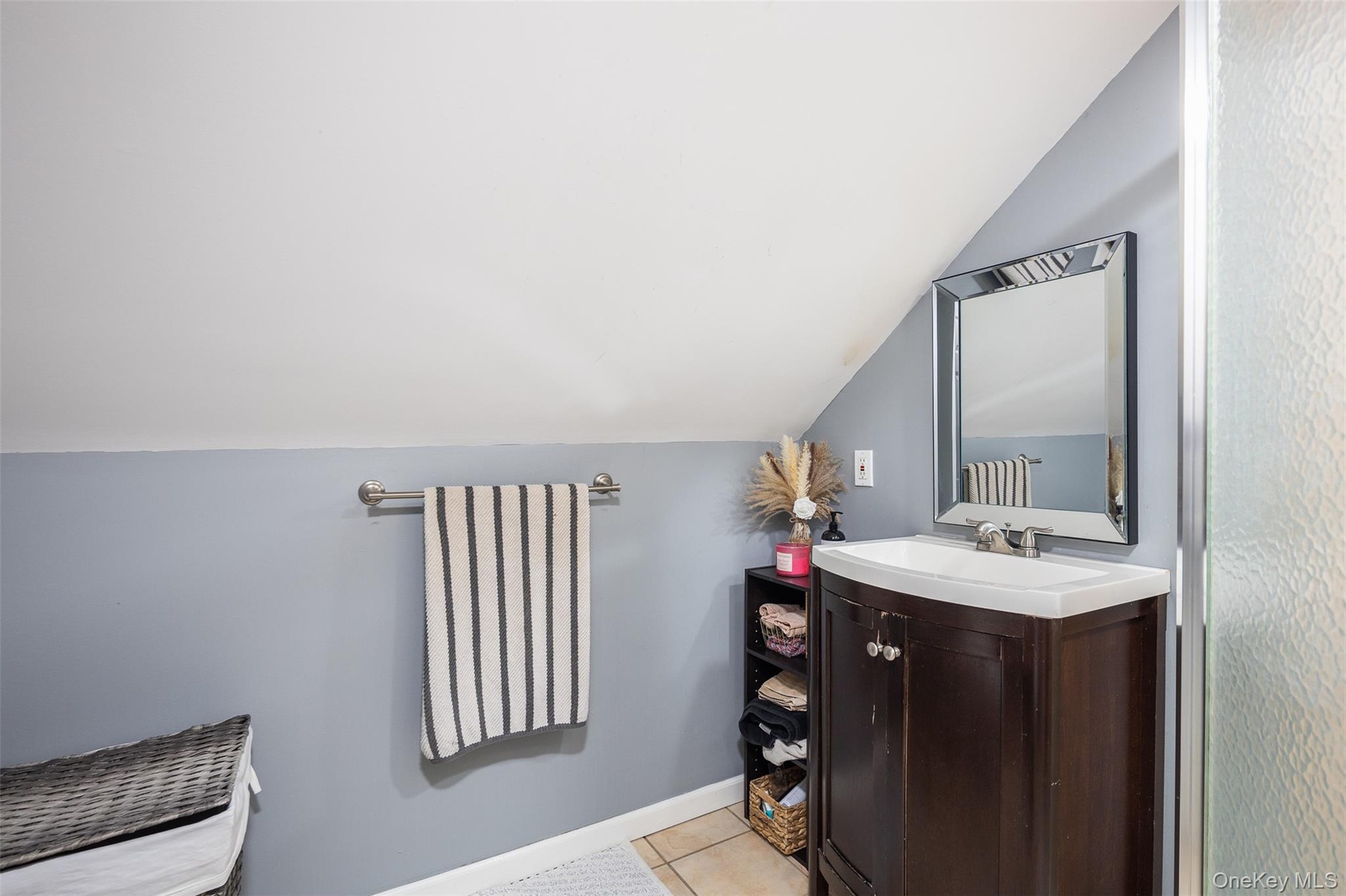 - Bathroom featuring light tile patterned floors, vanity, and vaulted ceiling