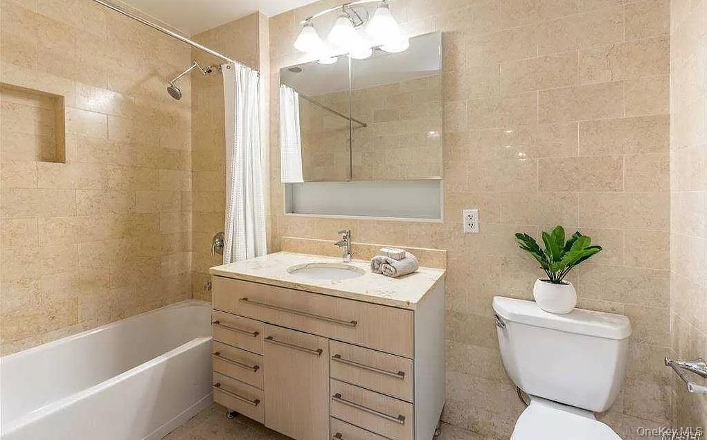 - Full bath featuring shower / tub combo, toilet, vanity, and tile walls