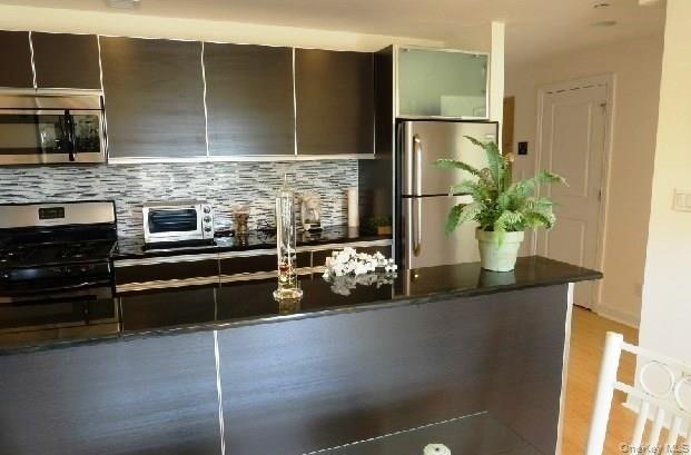 - Kitchen with decorative backsplash, dark brown cabinetry, a toaster, stainless steel appliances, and light wood-style flooring