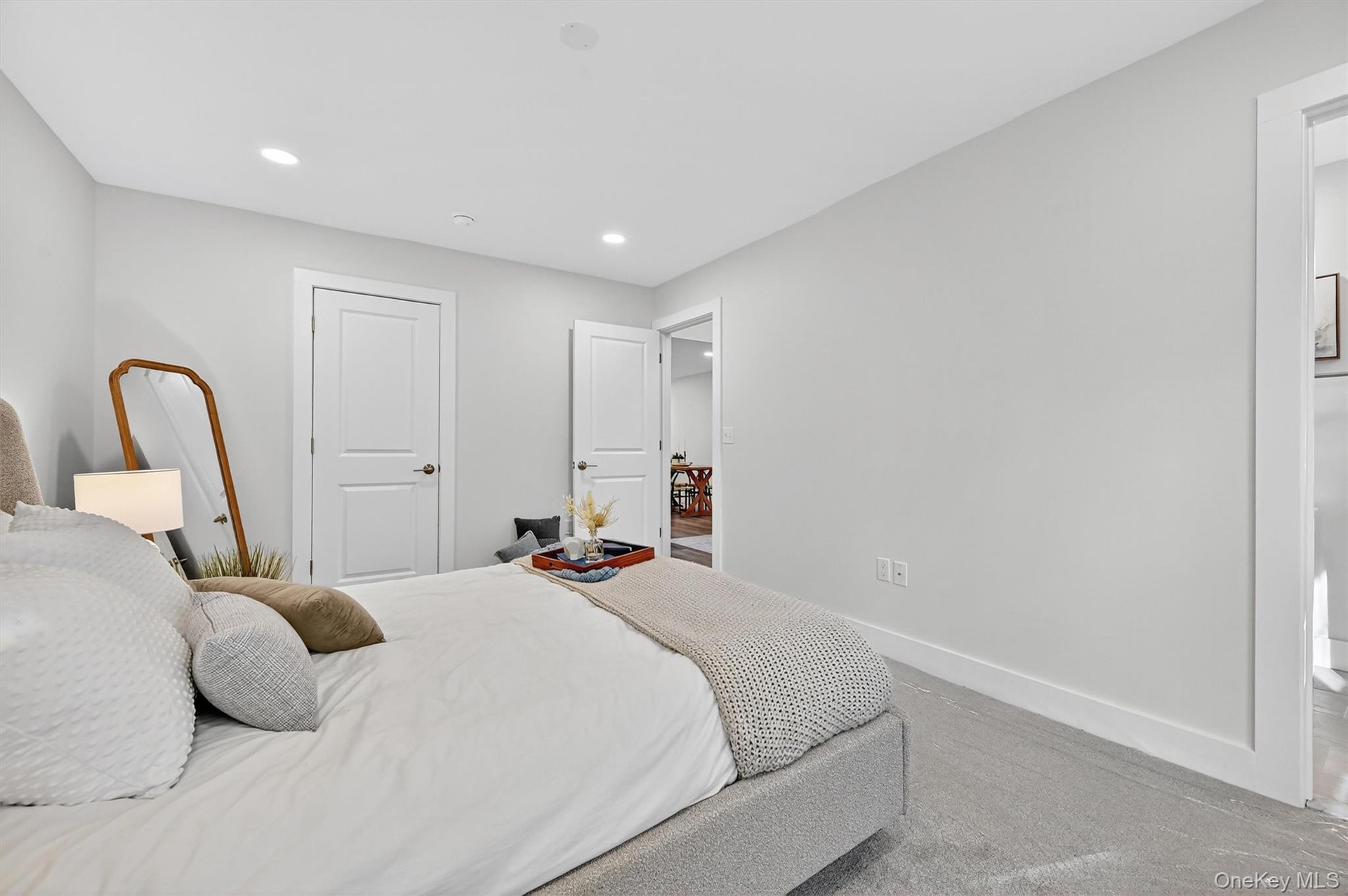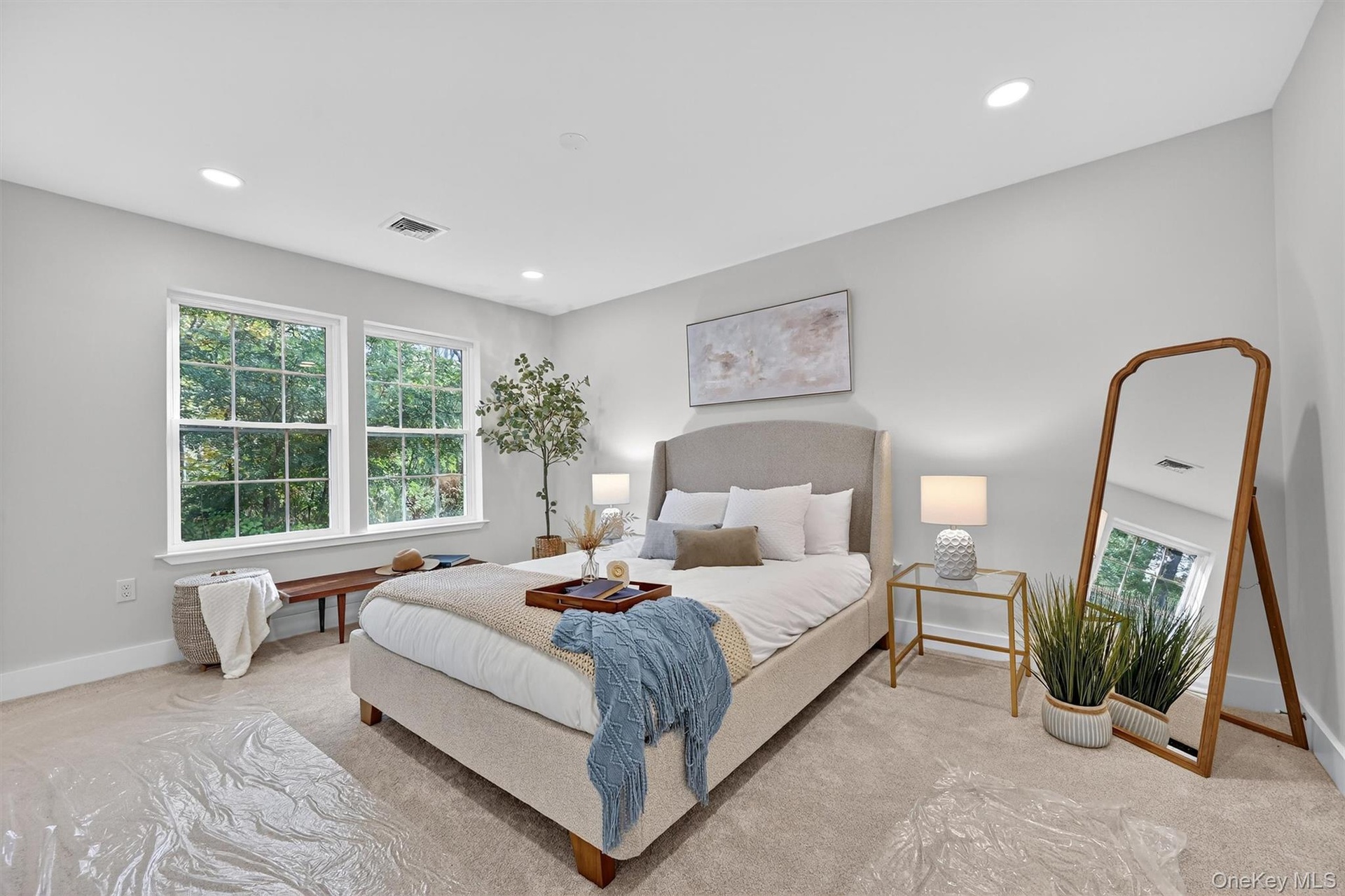 - Bedroom with multiple windows, carpet floors, and recessed lighting