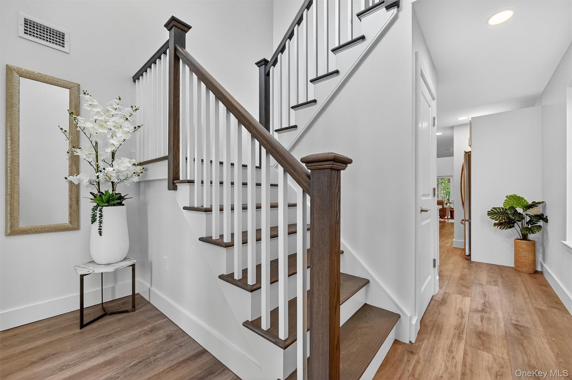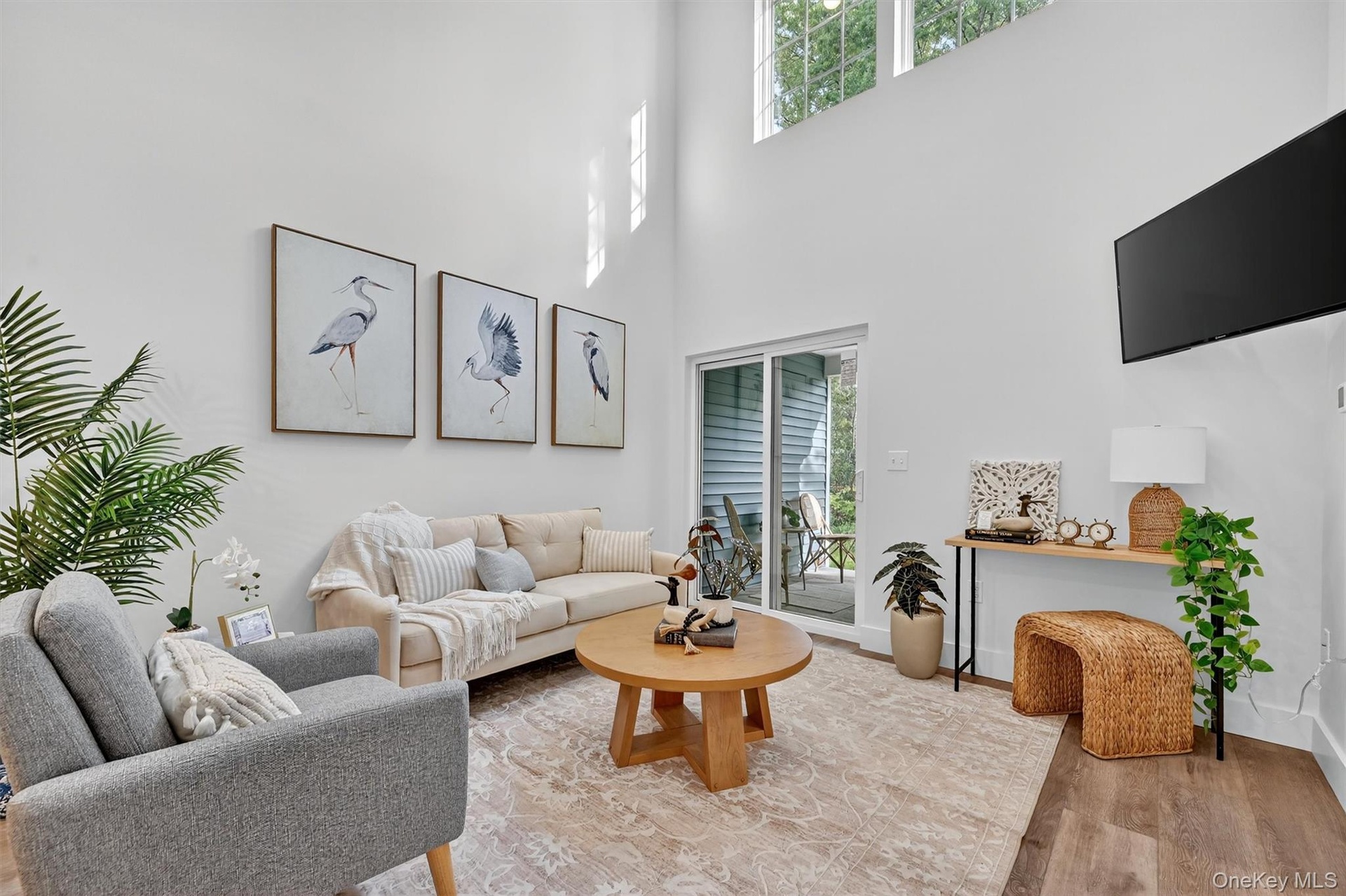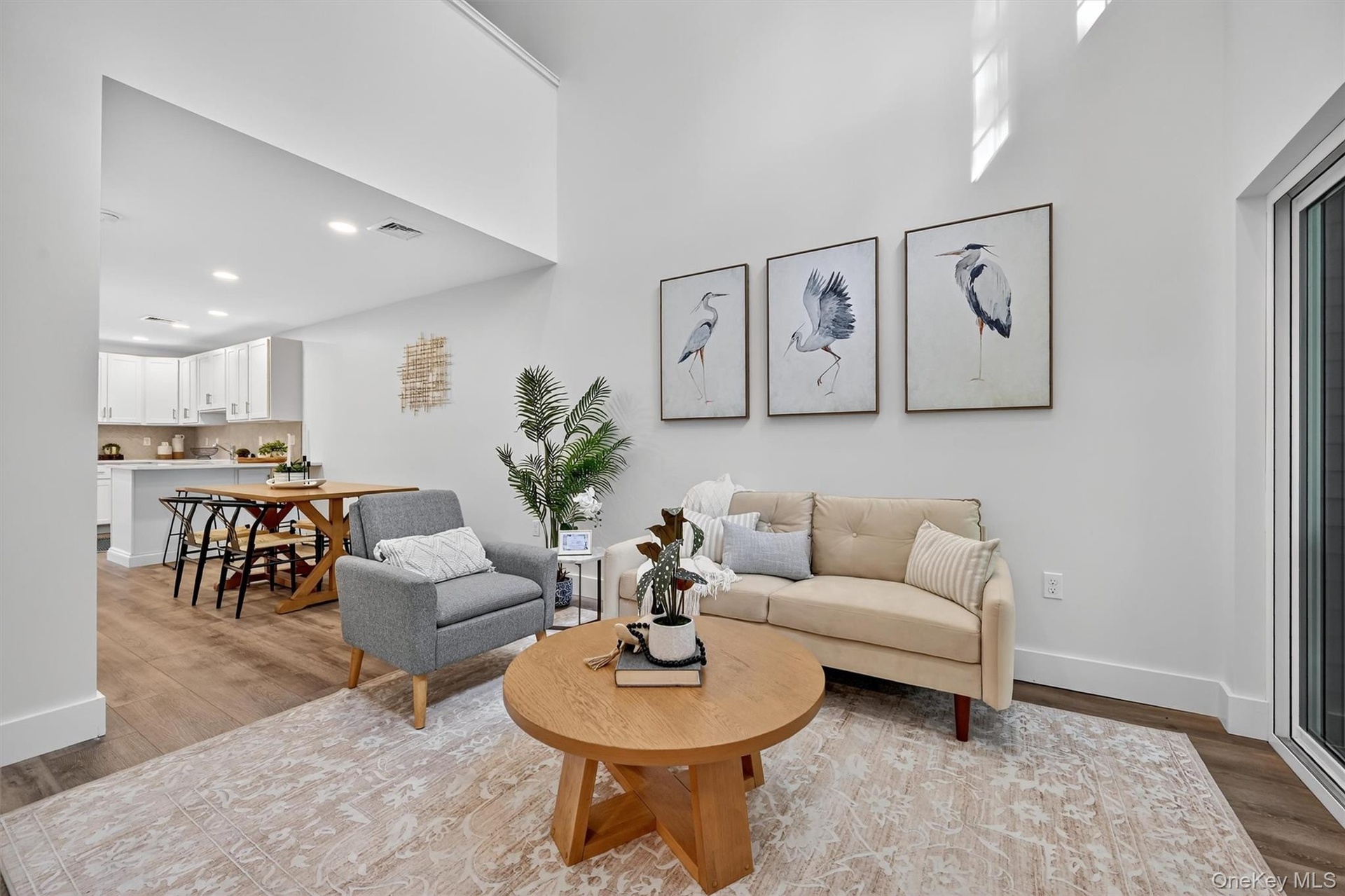 - Living room with light wood-style floors, recessed lighting, and a high ceiling