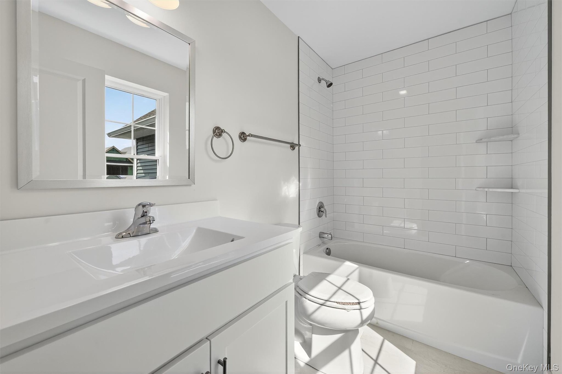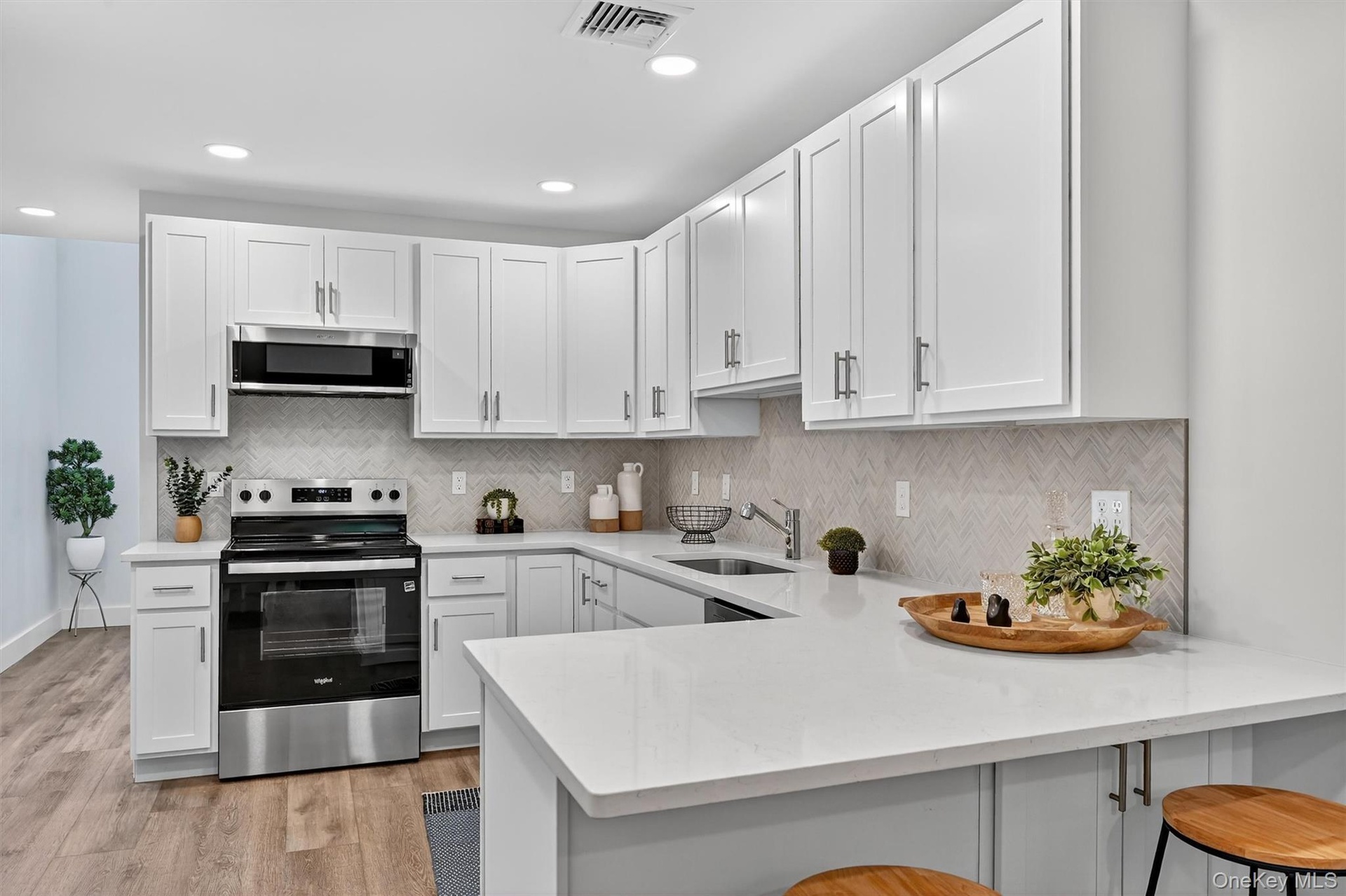 - Kitchen with stainless steel appliances, white cabinets, backsplash, a breakfast bar, and recessed lighting
