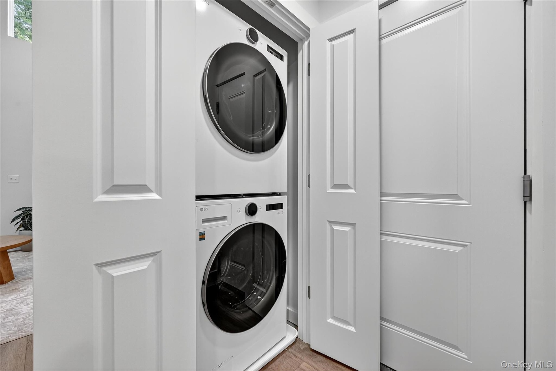 - Laundry area featuring stacked washer / dryer and wood finished floors