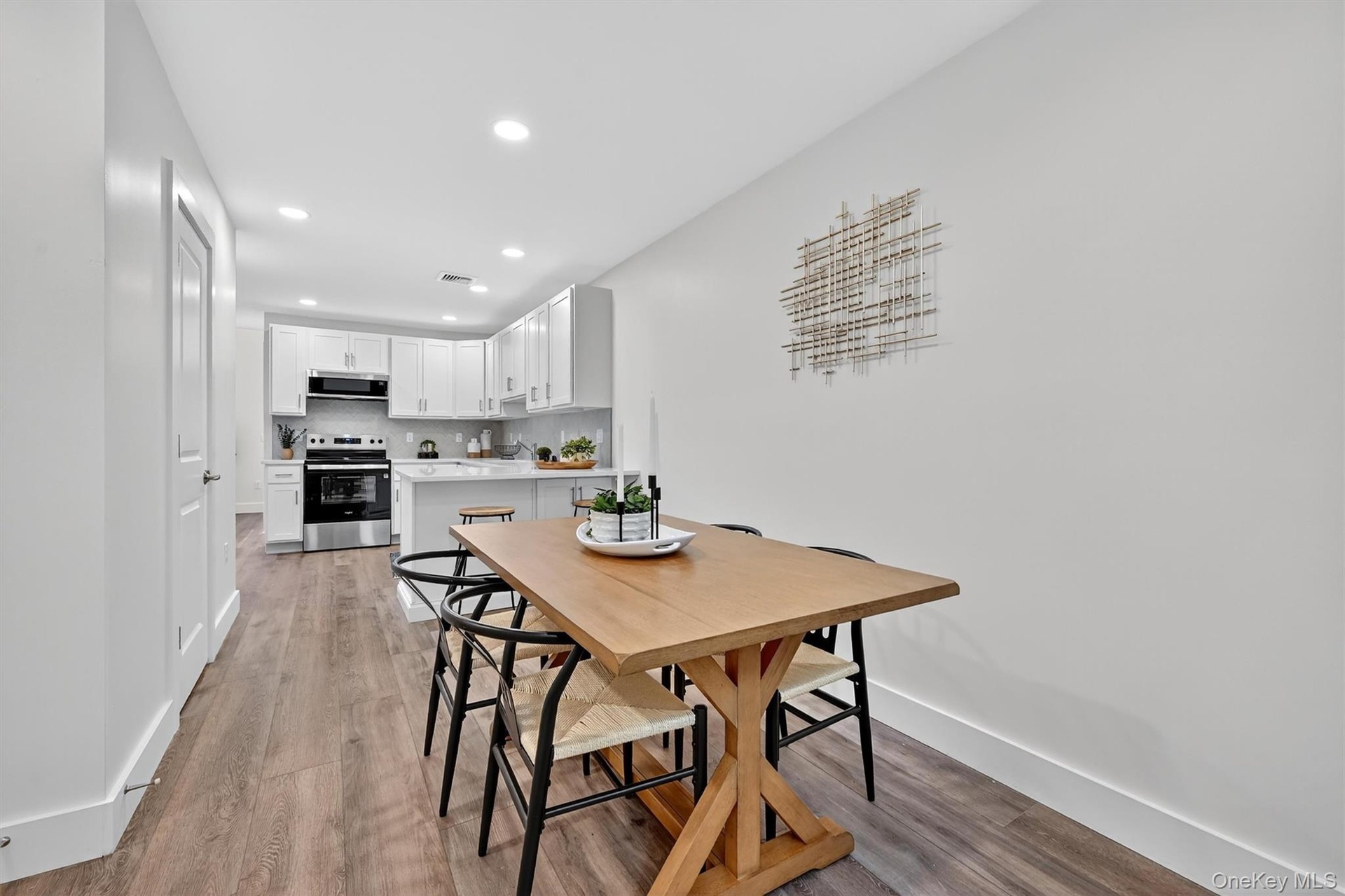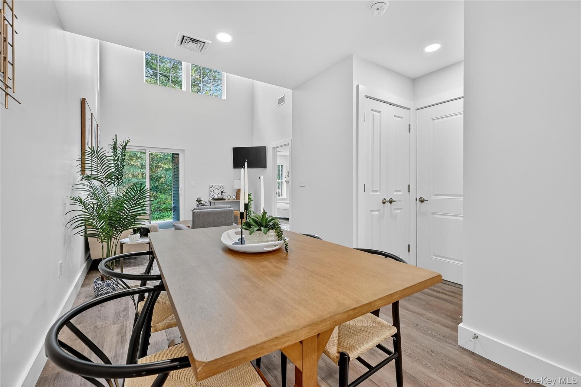 - Dining room with wood finished floors, recessed lighting, and a high ceiling