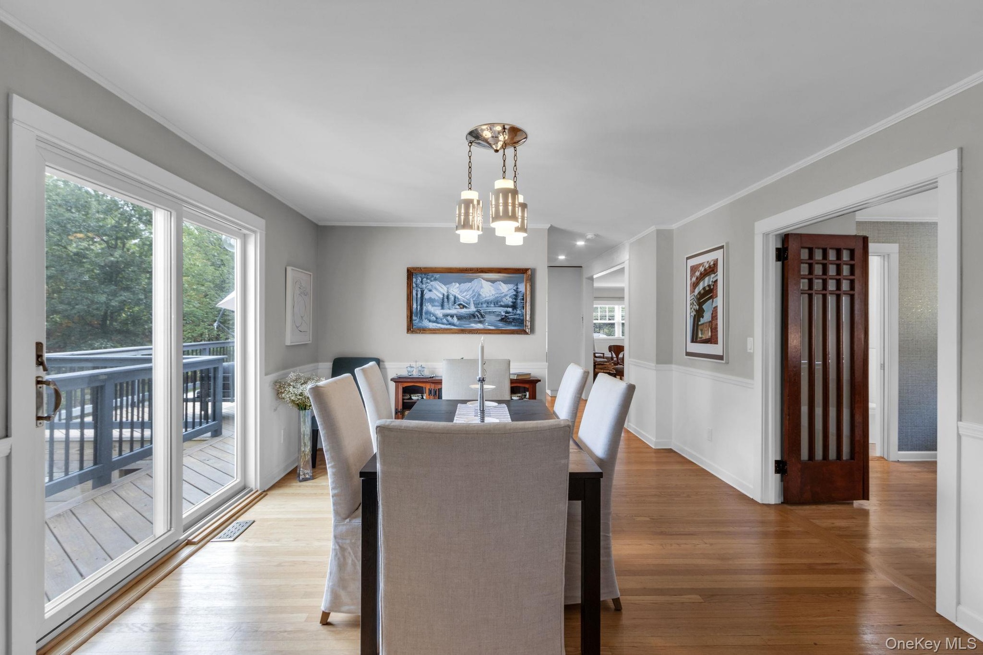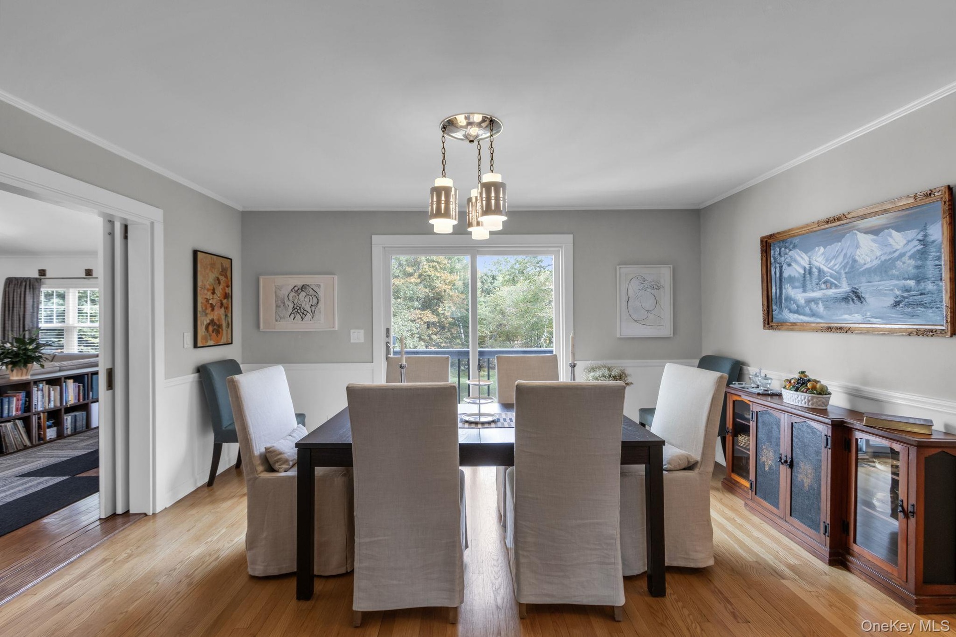 - Dining area with plenty of natural light, light wood-style flooring, wainscoting, crown molding, and a chandelier