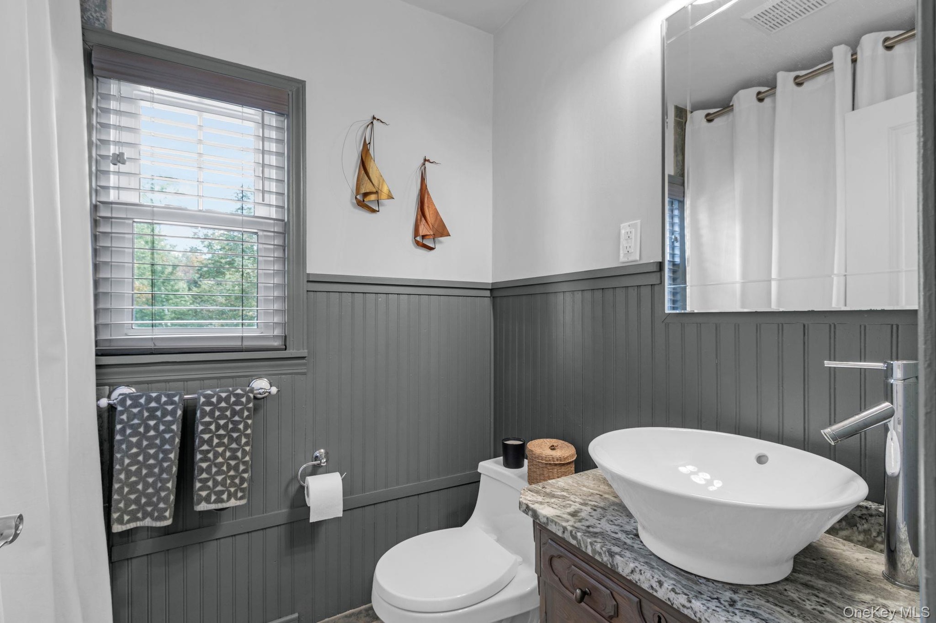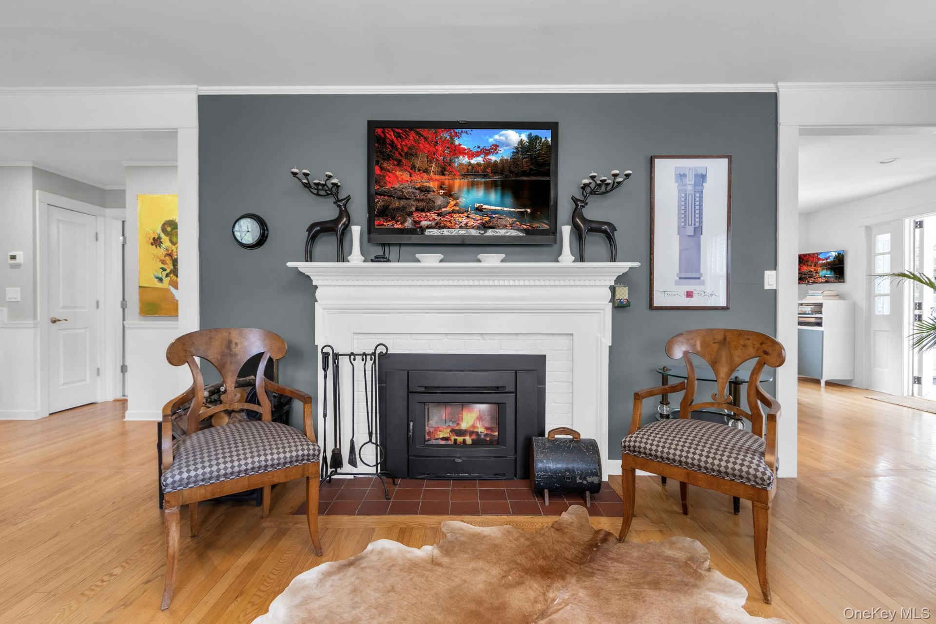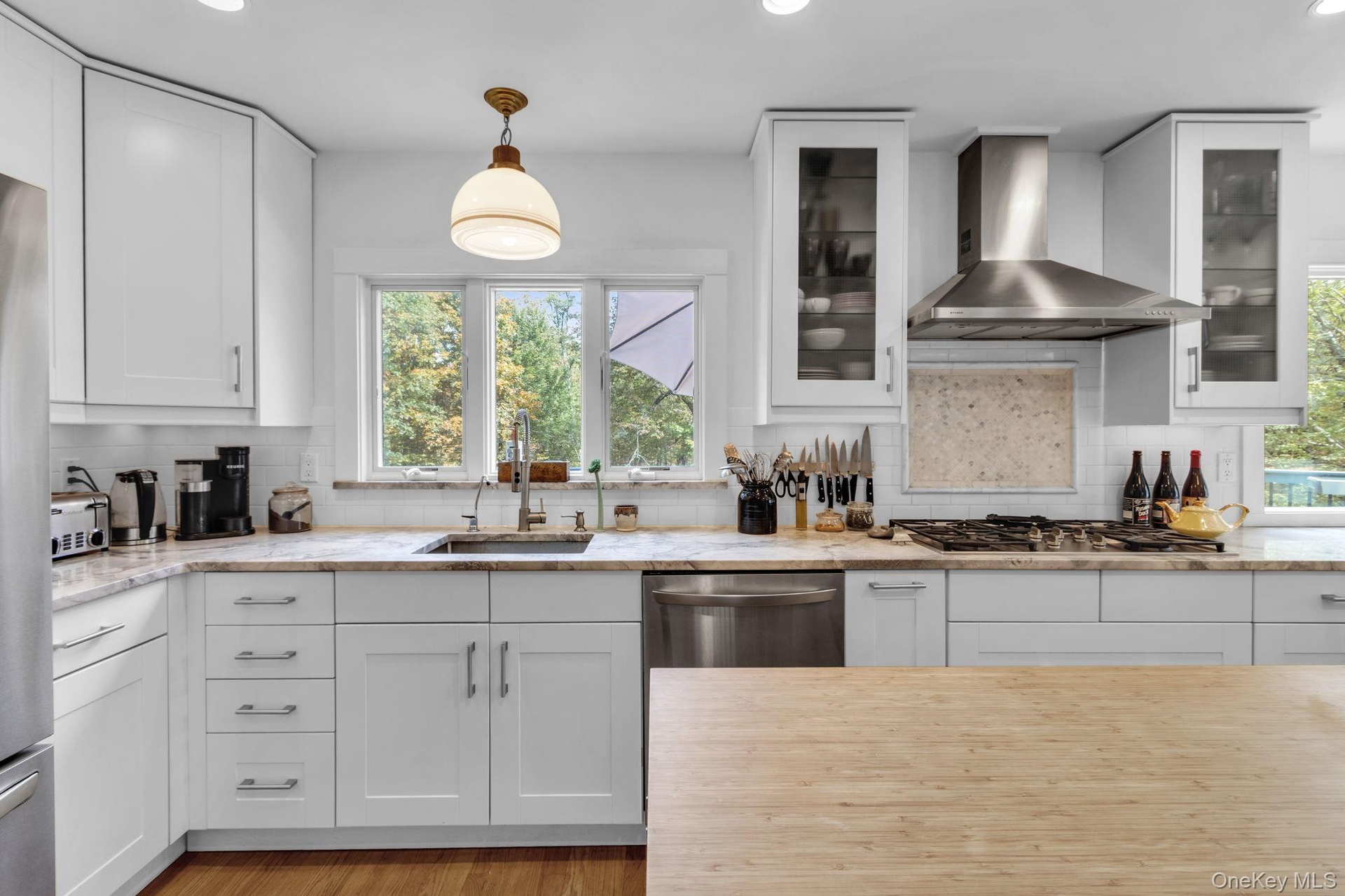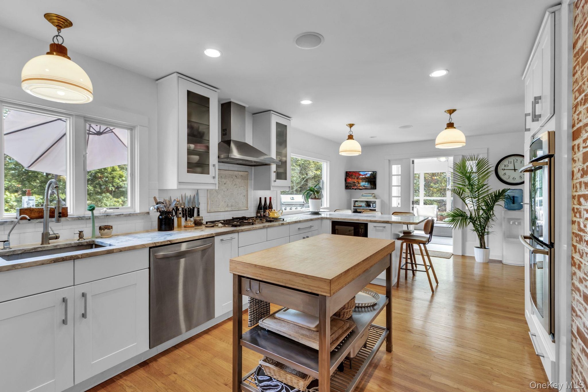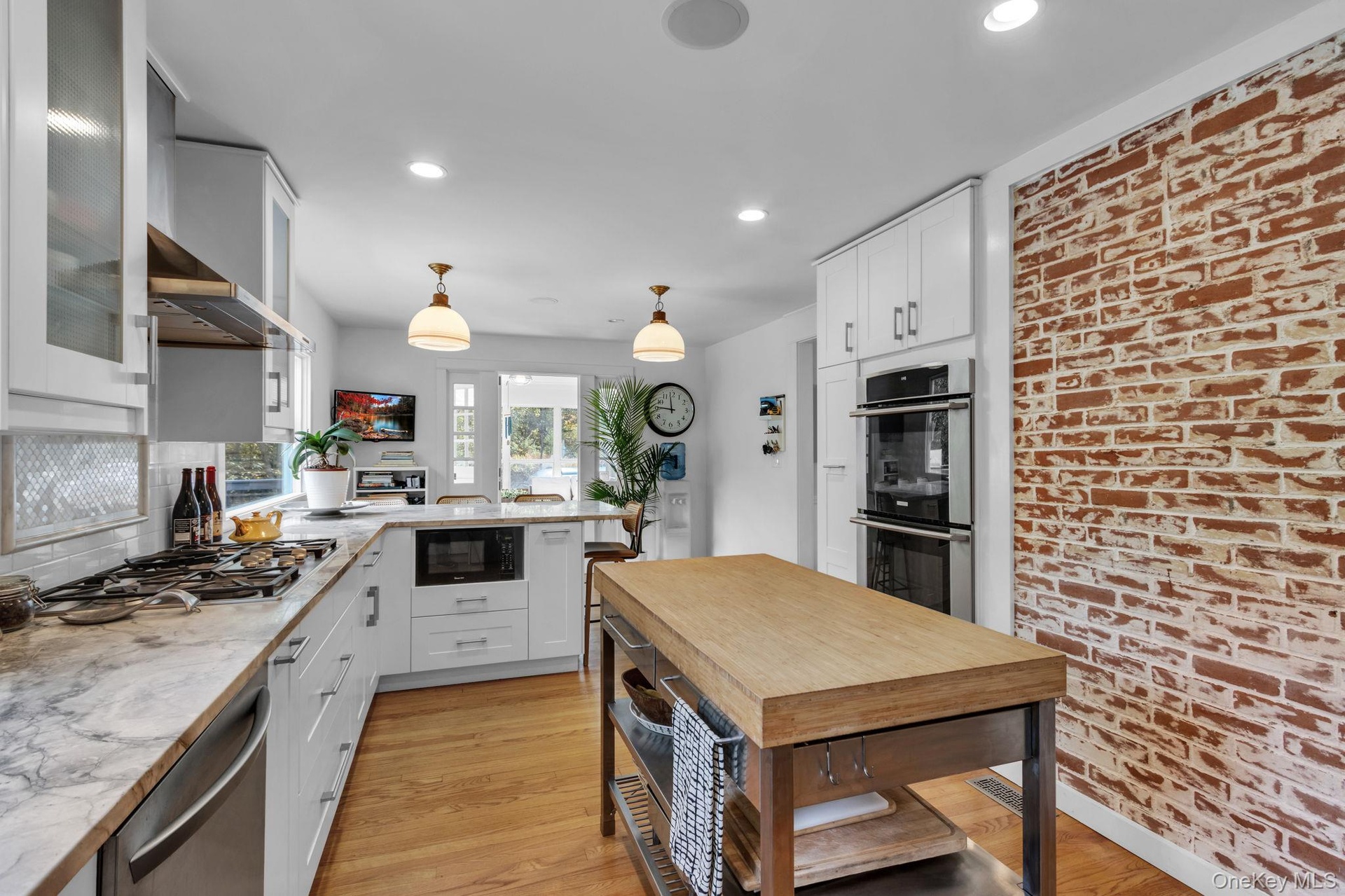 Step into the sun-drenched eat-in kitchen, where natural light pours in to showcase the quartzite countertops, exposed brick accents, and stainless steel appliances. A generous L-shaped island offers the ideal space for casual meals or entertaining guests while you cook. Just down the hall, a formal dining room with sliding glass doors leads directly to the expansive back deck—perfect for effortless indoor-outdoor gatherings.