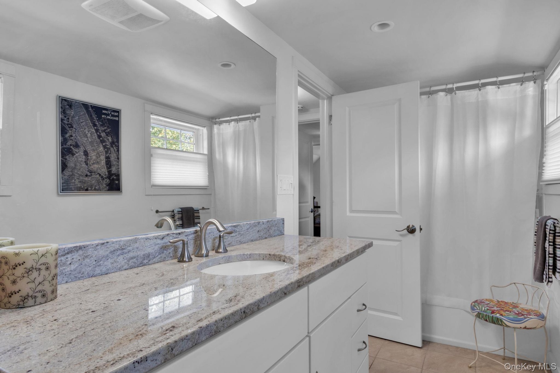 - Bathroom with vanity, light tile patterned flooring, and a shower with shower curtain